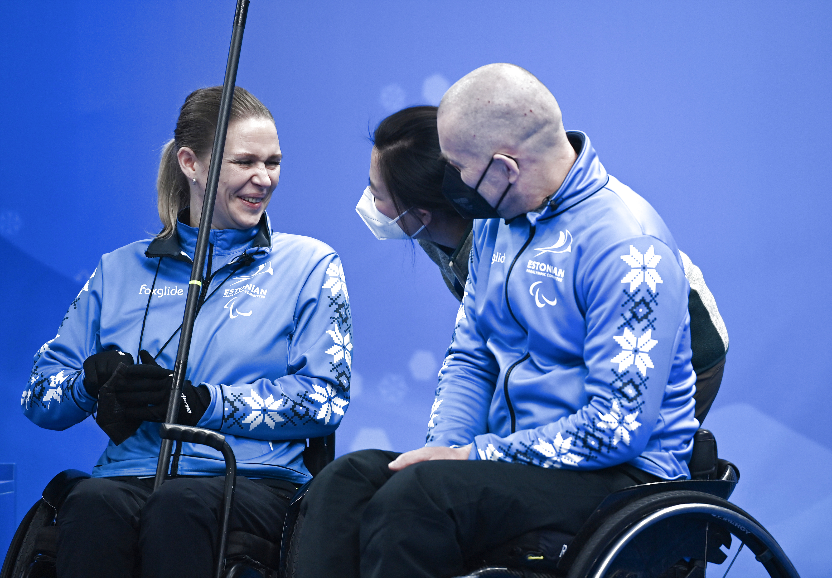 新华社照片,北京,2022年3月7日 (新华全媒+·北京冬残奥会)(4)轮椅上的“倩影”闪耀“冰立方” “三八”国际劳动妇女节前夕,北京2022年冬残奥会轮椅冰壶比赛在国家游泳中心“冰立方”激战正酣。轮椅冰壶赛制要求每队至少有1名女队员参赛。这些坐在轮椅上的女运动员在赛场内外流露出的坚毅眼神、灿烂笑容以及身上佩戴的特色配饰,都展现出她们自强、自信、乐观的精神面貌,以及对体育运动的热衷、对生活的热爱。 爱沙尼亚队选手卡特琳·里德巴赫(左)在轮椅冰壶循环赛中与工作人员交流(3月6日摄)。 新华社记者 张博文 摄