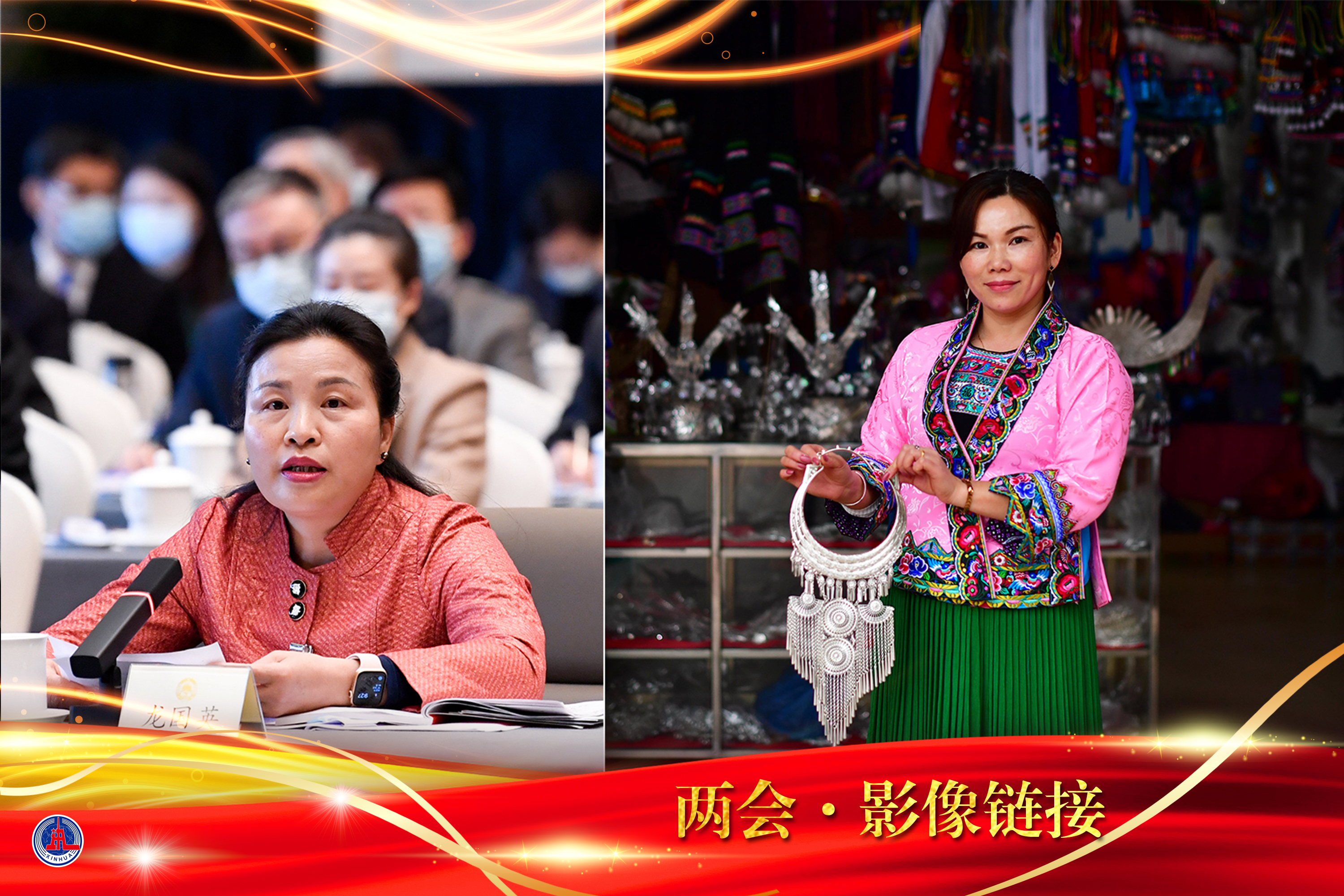 新华社照片,北京,2022年3月7日 龙国英委员:发挥妇女重要作用 全力助推乡村振兴 左图:全国政协委员龙国英建议,发挥妇女重要作用,全力助推乡村振兴。新华社记者 申宏 摄 右图:在广西融水苗族自治县一家苗族服饰作坊,返乡创业村民黄玉萍在展示苗族银饰(2020年3月13日摄)。新华社记者 黄孝邦 摄 新华社发