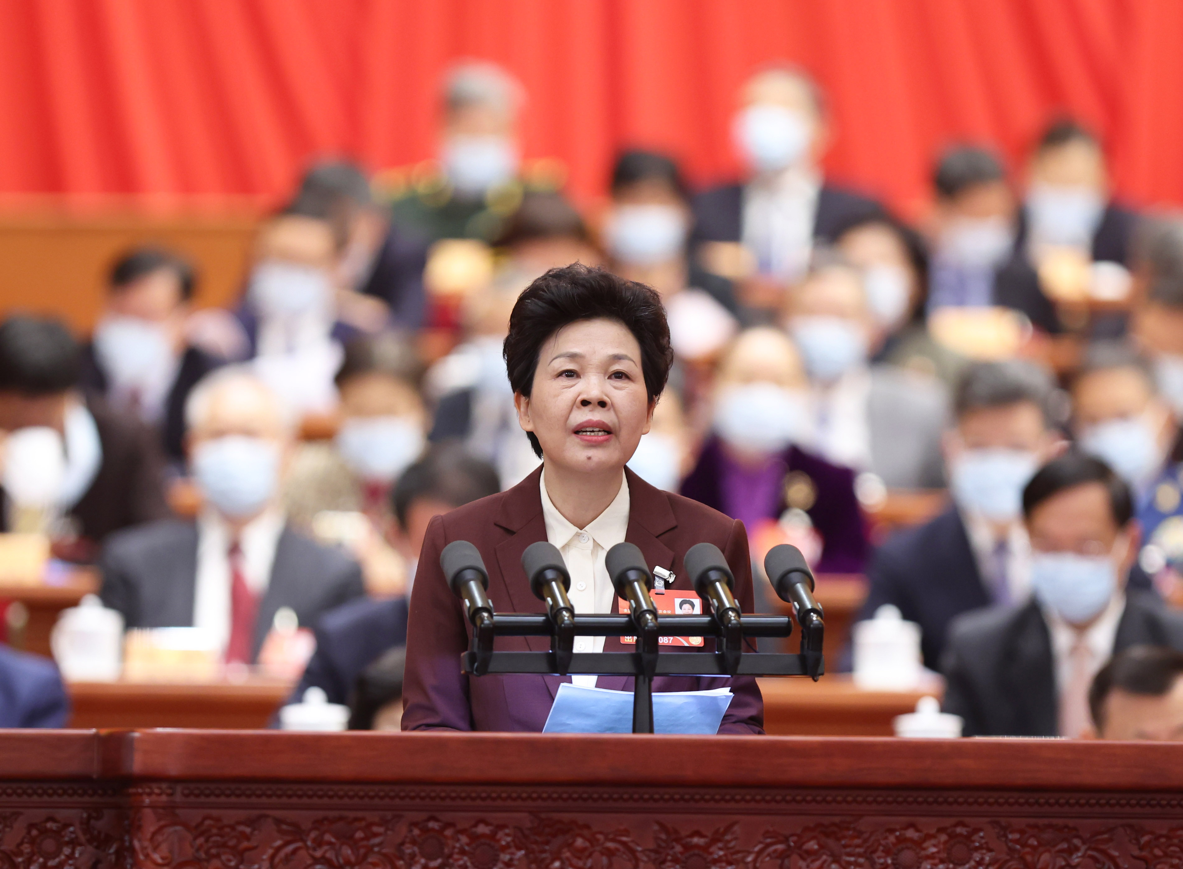 新华社照片,北京,2022年3月7日 全国政协十三届五次会议第二次全体会议大会发言 3月7日,全国政协十三届五次会议在北京人民大会堂举行第二次全体会议。这是葛慧君委员作大会发言。 新华社记者 丁林 摄