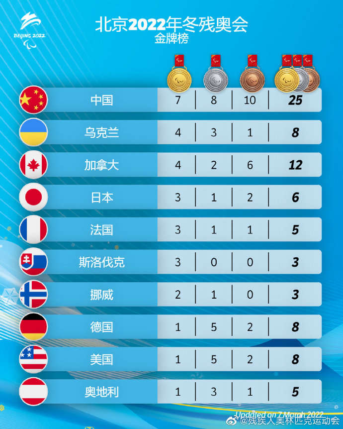 今天,北京冬残奥会第三比赛日共在高山滑雪、越野滑雪、单板滑雪赛场上产生14枚金牌。中国队凭借单日收获9枚奖牌(1金4银4铜)的表现继续领跑金牌榜。为残奥运动员的拼搏精神点赞!