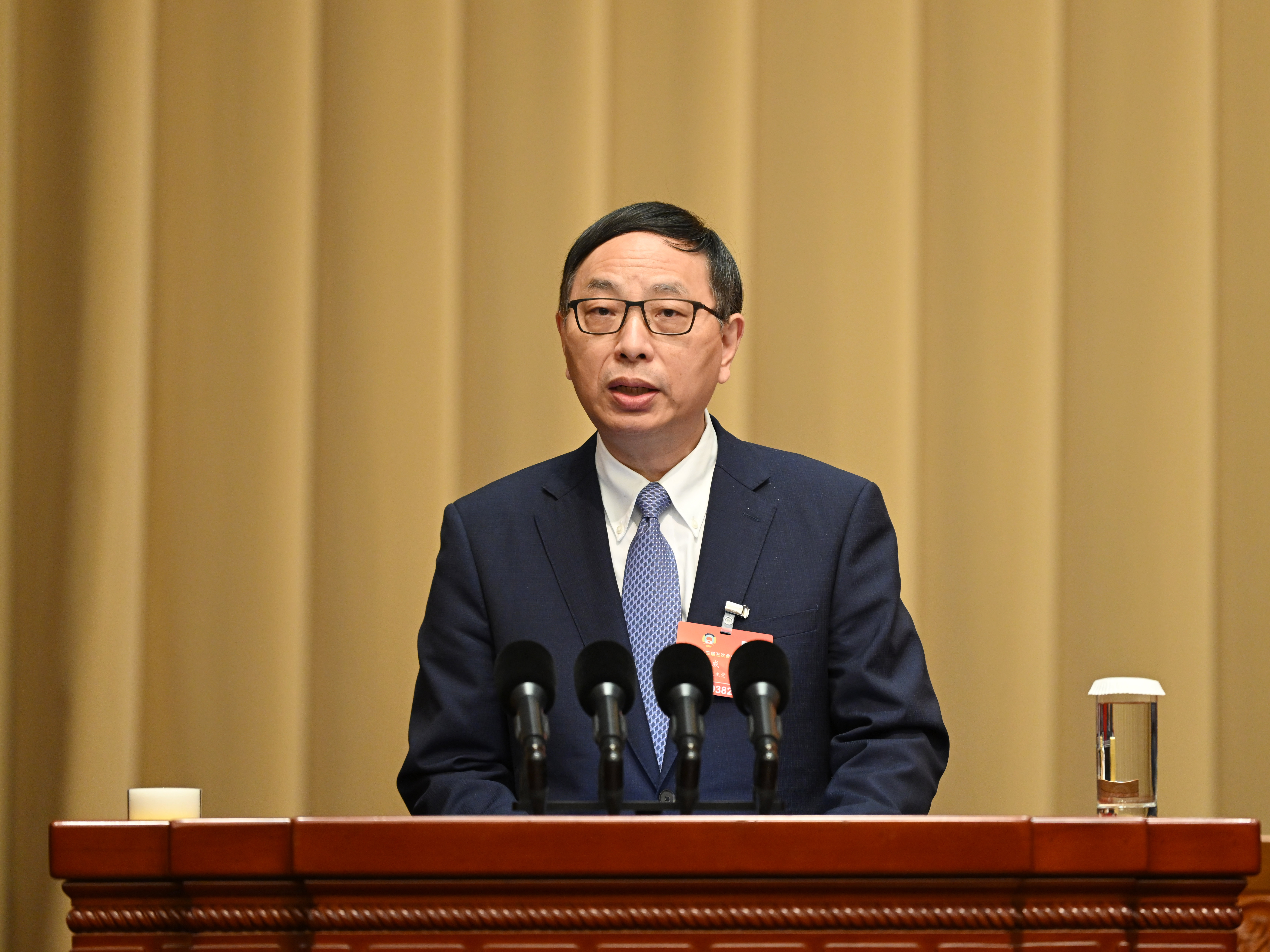 新华社照片,北京,2022年3月7日 全国政协十三届五次会议举行视频会议 12名委员作大会发言 3月7日,全国政协十三届五次会议举行视频会议。12名委员作大会发言。这是在主会场,蔡威委员代表农工党中央作大会发言。 新华社记者 殷博古 摄