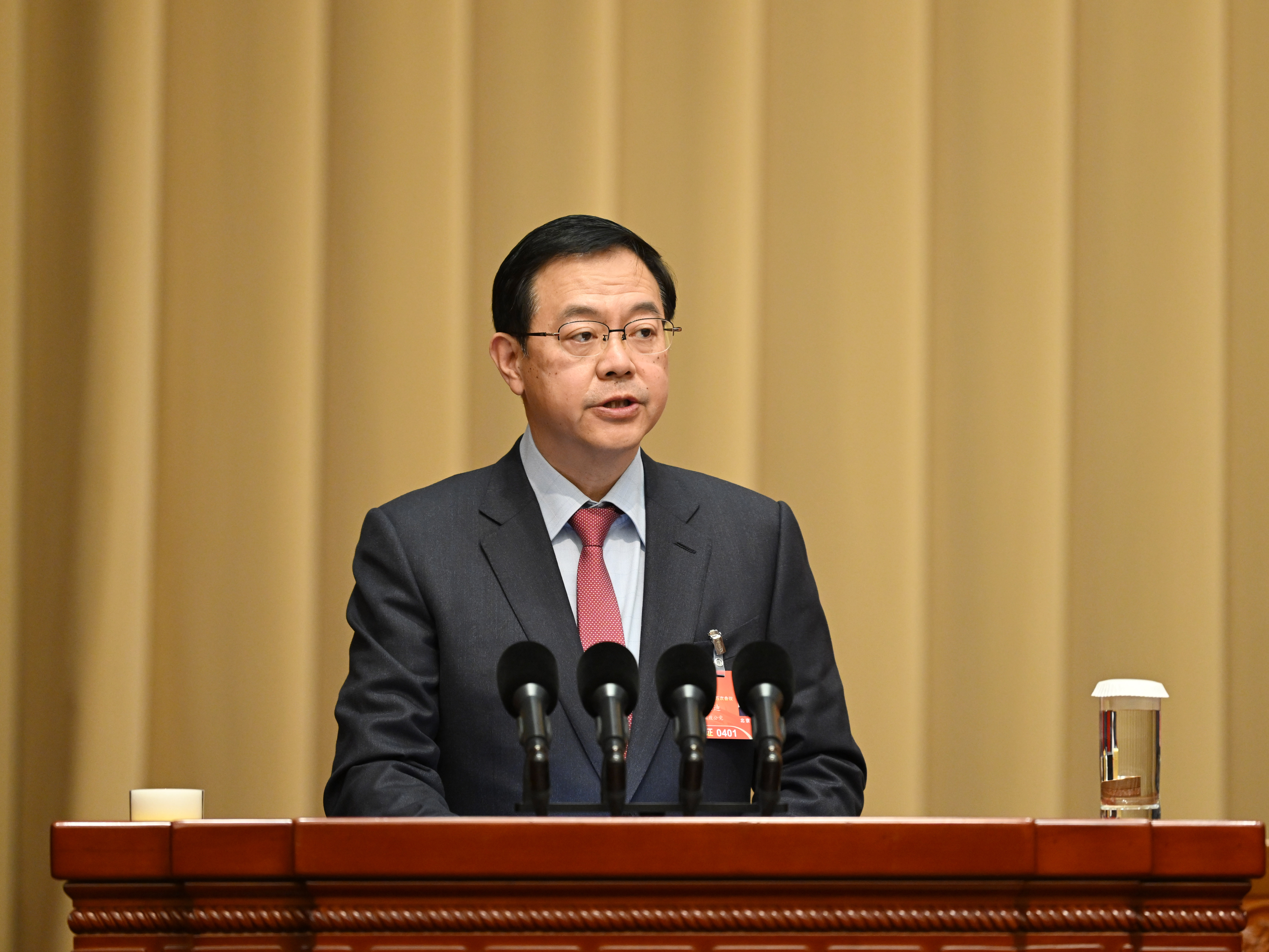 新华社照片,北京,2022年3月7日 全国政协十三届五次会议举行视频会议 12名委员作大会发言 3月7日,全国政协十三届五次会议举行视频会议。12名委员作大会发言。这是在主会场,张恩迪委员代表致公党中央作大会发言。 新华社记者 殷博古 摄