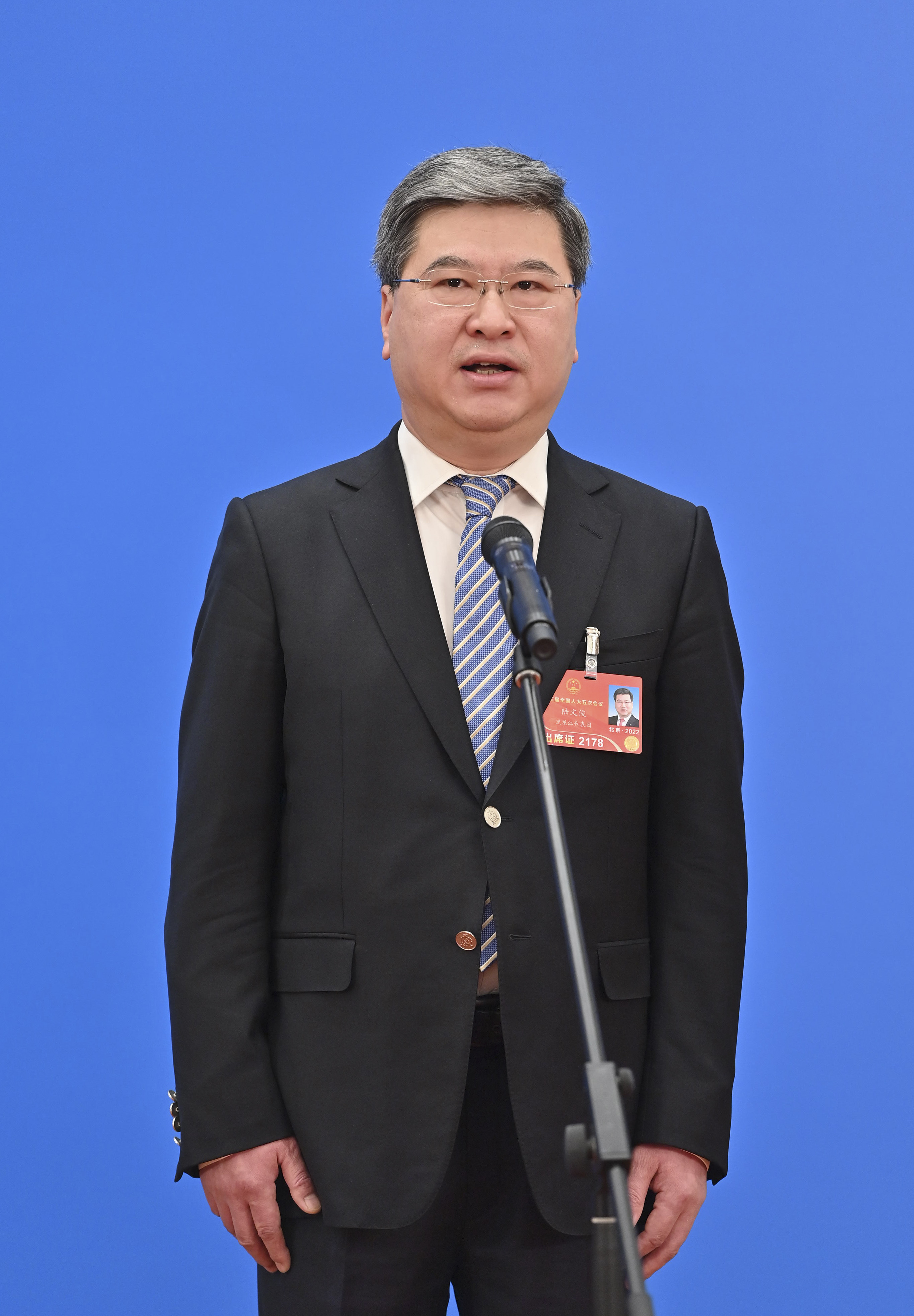 新华社照片,北京,2022年3月8日 聚焦“代表通道” 3月8日,第十三届全国人民代表大会第五次会议举行第二场“代表通道”采访活动。这是全国人大代表陆文俊通过网络视频方式接受采访。 新华社记者 李鑫 摄
