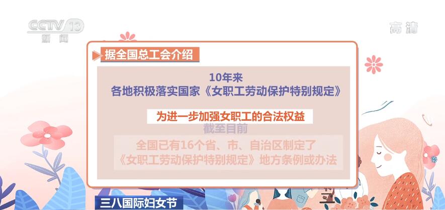 据全国总工会介绍,10年来,各地积极落实国家《女职工劳动保护特别规定》,为进一步加强女职工的合法权益。截至目前,全国已有16个省、市、自治区制定了《女职工劳动保护特别规定》地方条例或办法。