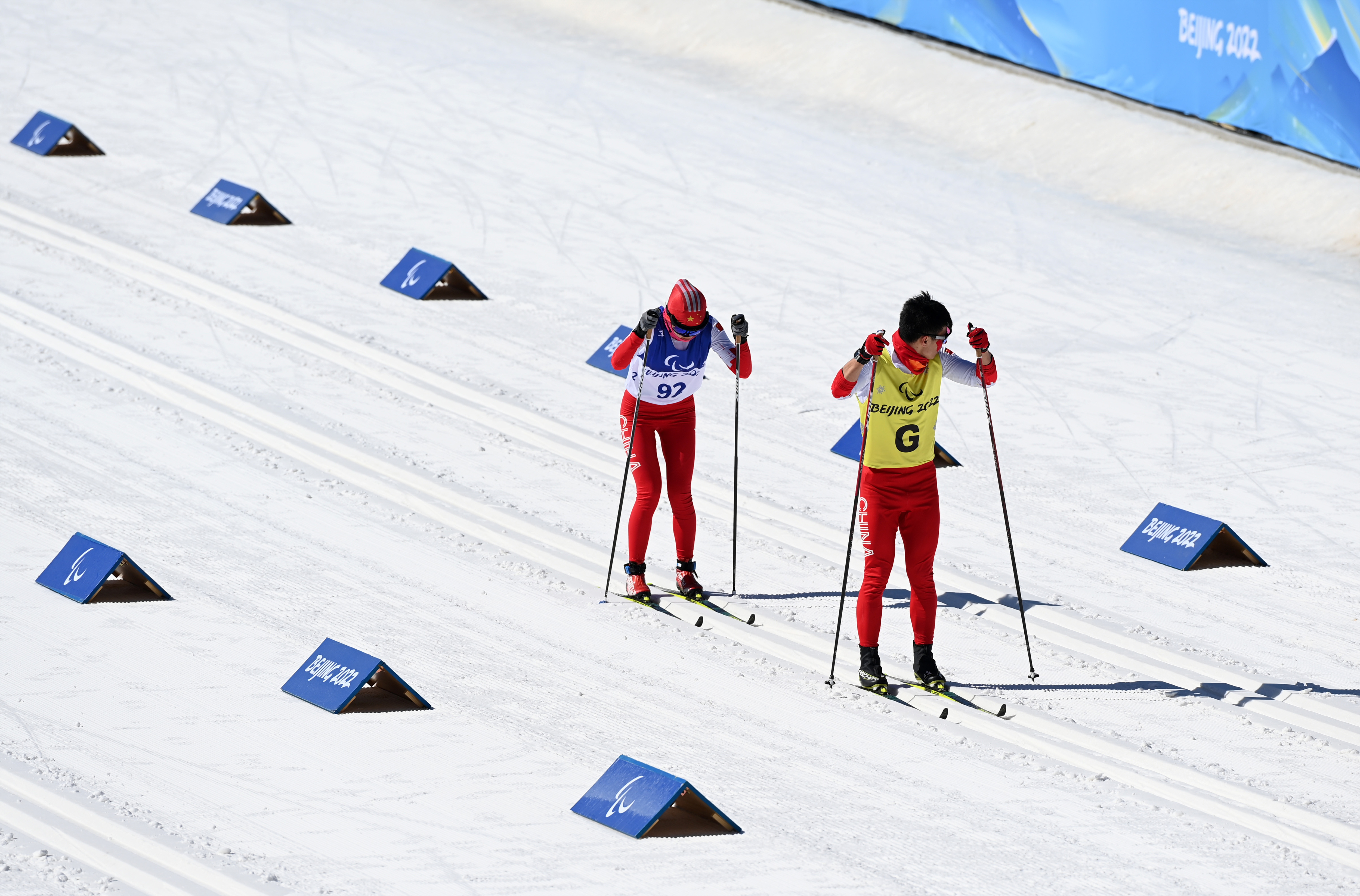 2022年3月7日,北京冬残奥会残奥越野滑雪——女子长距离传统技术(视障)赛况。中国选手王跃(左)和引导员李亚林在比赛中,王跃获得第四名。来源:新华社