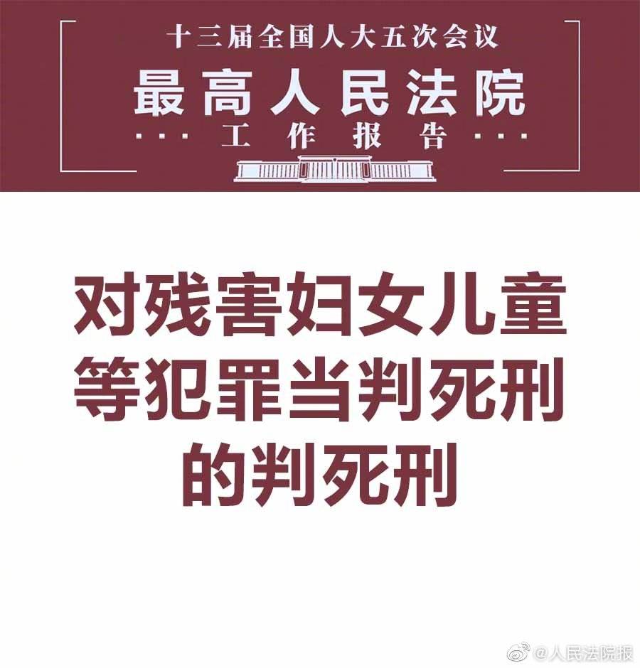 最高法工作报告:人民法院准确贯彻死刑政策,对严重危害公共安全、严重影响群众安全感的犯罪,对残害妇女儿童、老年人等挑战法律和伦理底线的犯罪,论罪当判死刑的,依法判处并核准死刑,坚决维护法治权威。