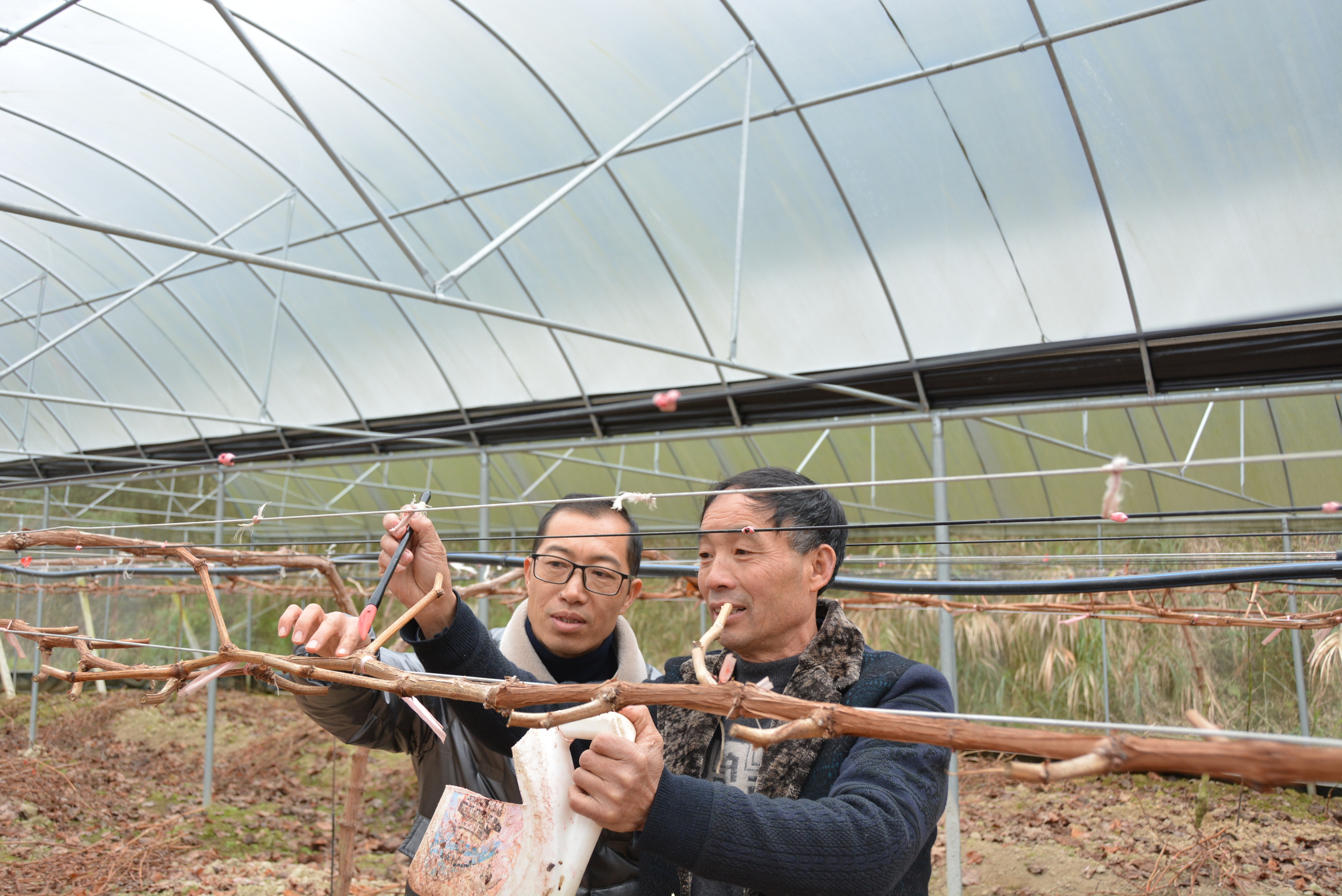 2月9日,南平市建阳区麻沙镇科技特派员姚长春在葡萄大棚里指导麻沙镇水南村村民刘贵道(右)点芽。 新华社记者张华迎 摄