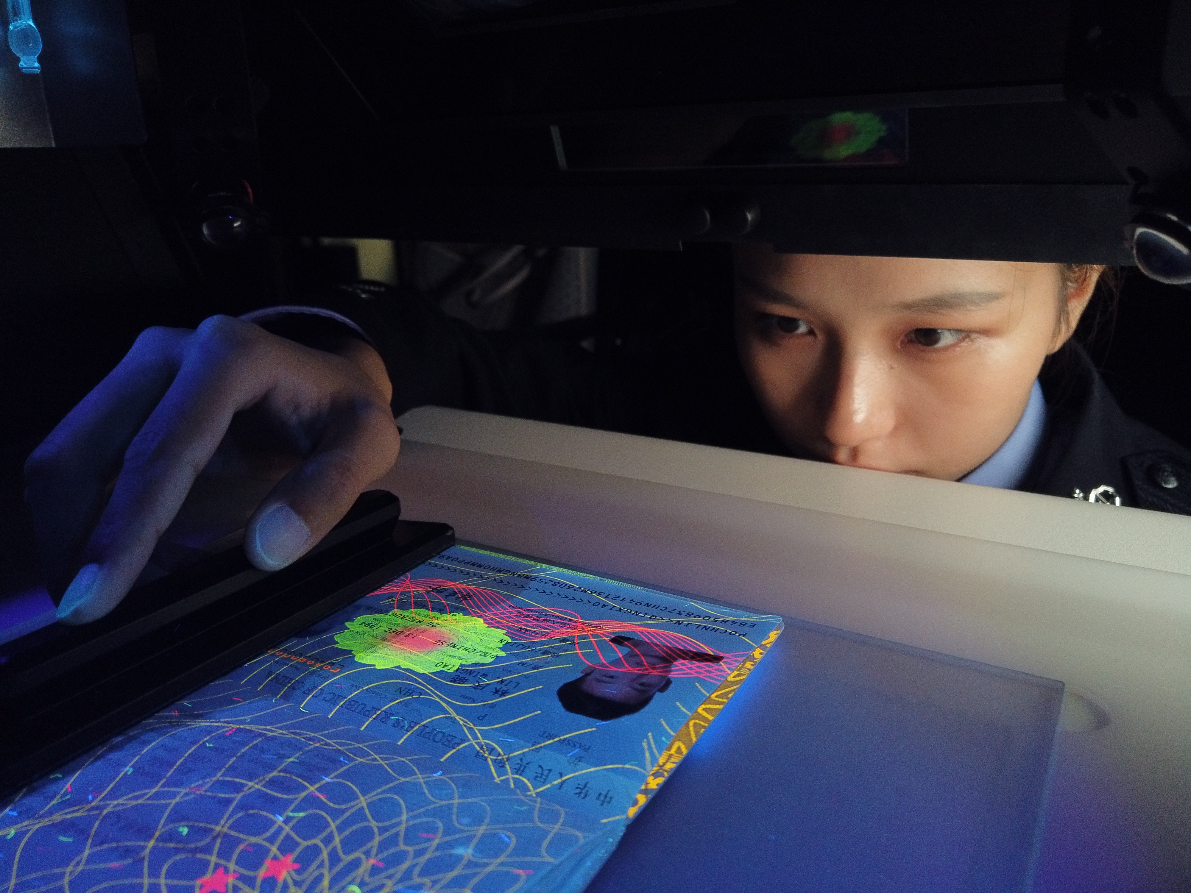 花成用拇指轻拨翻开护照,在手里查过一道,心中有了大致判断。随后,她转身启动仪器,左手压稳证件,把特定签证页置于检测镜头下,不断变换和调校拍摄角度,右手握着鼠标,在电脑显示屏上熟练点击,操纵着仪器内的各种光源,直到屏幕上呈现出一个个足以为证件定性的清晰画面。