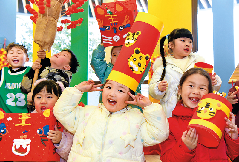 2022年1月12日,福建省武夷山市百花幼儿园的小朋友们在游园活动上展示自制的虎元素饰品 陈颖摄/本刊