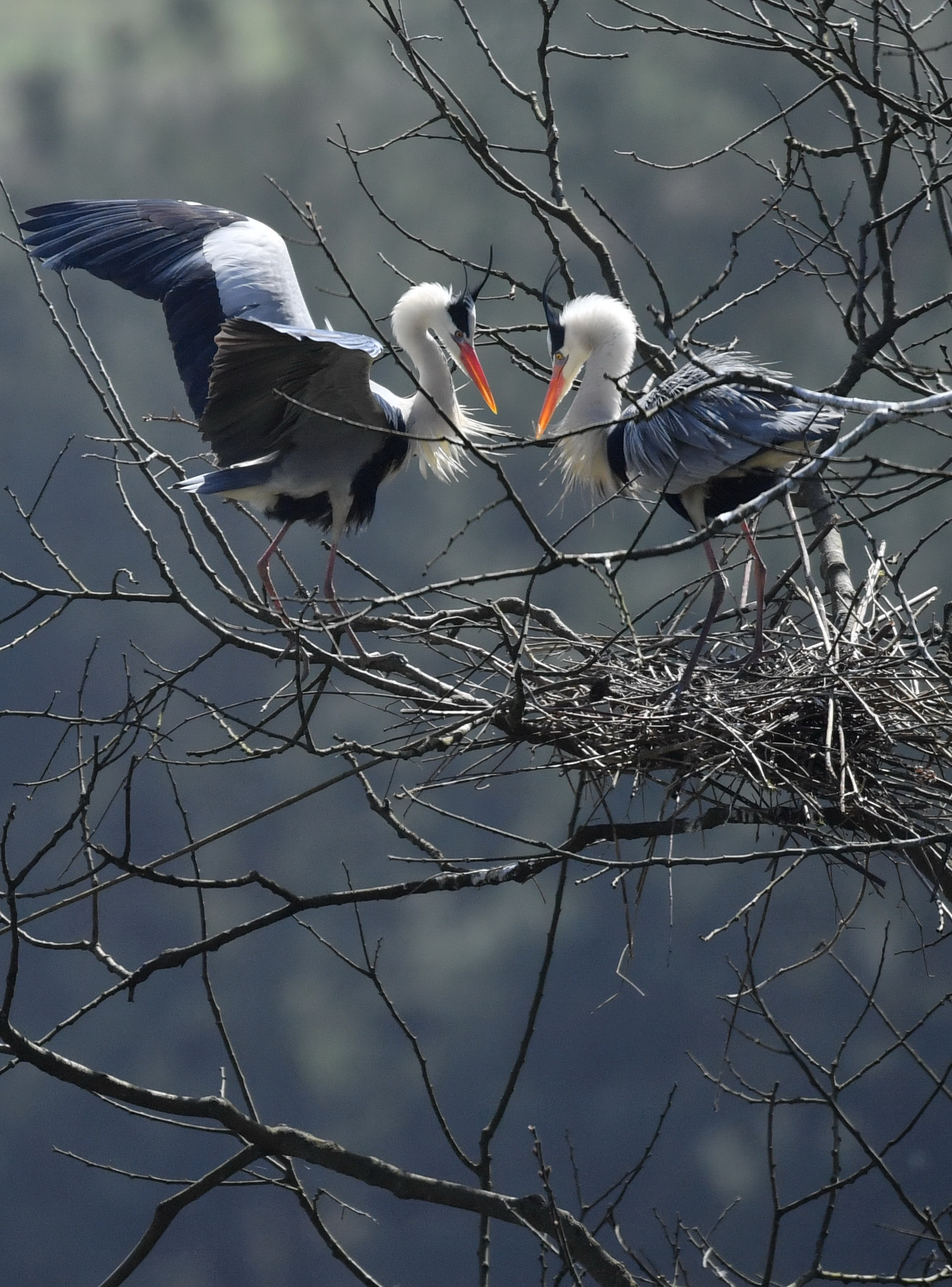 新华社照片,贵阳,2022年3月8日 春之歌 3月7日,在贵州省贵阳市开阳县禾丰乡党寨村,两只苍鹭忙着衔树枝筑巢。 春回大地,万物复苏,神州大地奏起春的交响曲。 新华社发(乔启明 摄)