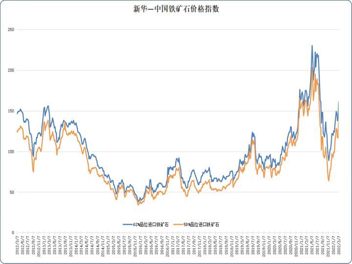 新华财经北京3月8日电(郑豪)新华-中国铁矿石价格指数显示,3月1日至3月7日间,进口铁矿石价格大幅上涨。数据显示,3月7日,我国62%品位进口铁矿石价格指数为161,较2月28日上涨16.67%;58%品位进口铁矿石价格指数为141,较2月28日上涨20.51%。
