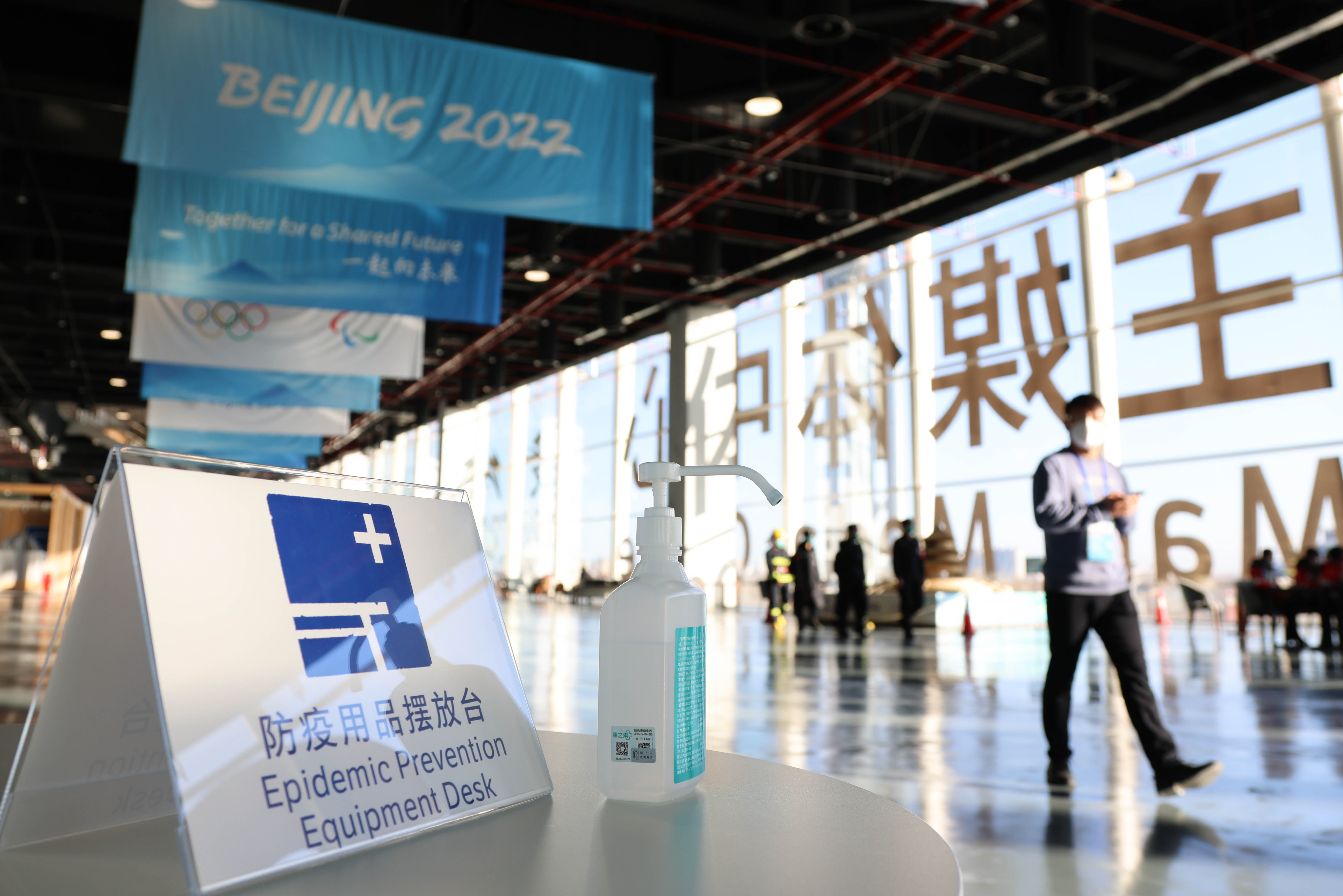 这是1月10日在主媒体中心内拍摄的防疫消毒用品。新华社记者徐子鉴摄