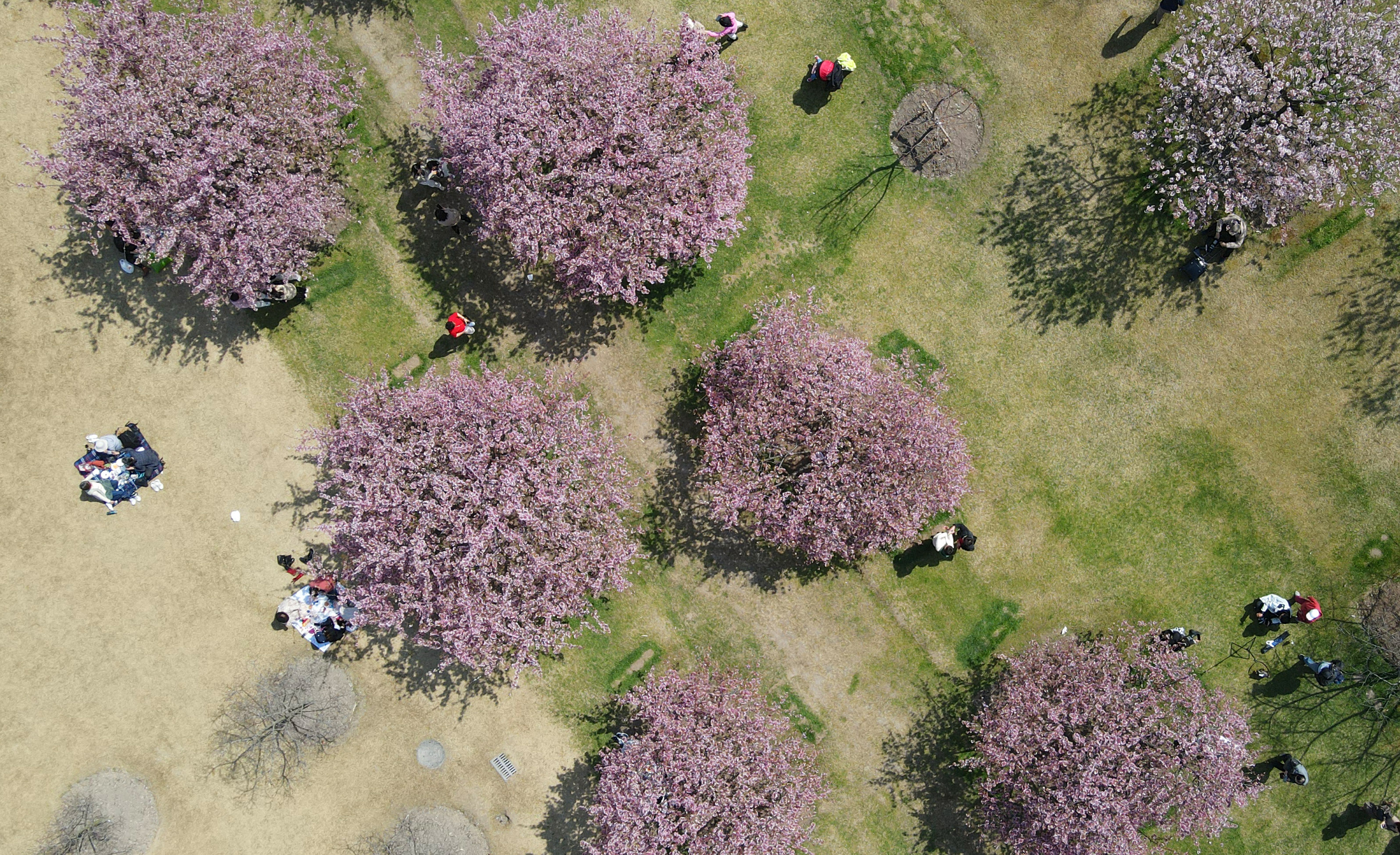新华社照片,上海,2022年3月8日 春之歌 3月8日,游人在上海辰山植物园盛开的樱花树下休闲散步(无人机照片)。 春回大地,万物复苏,神州大地奏起春的交响曲。 新华社记者 方喆 摄