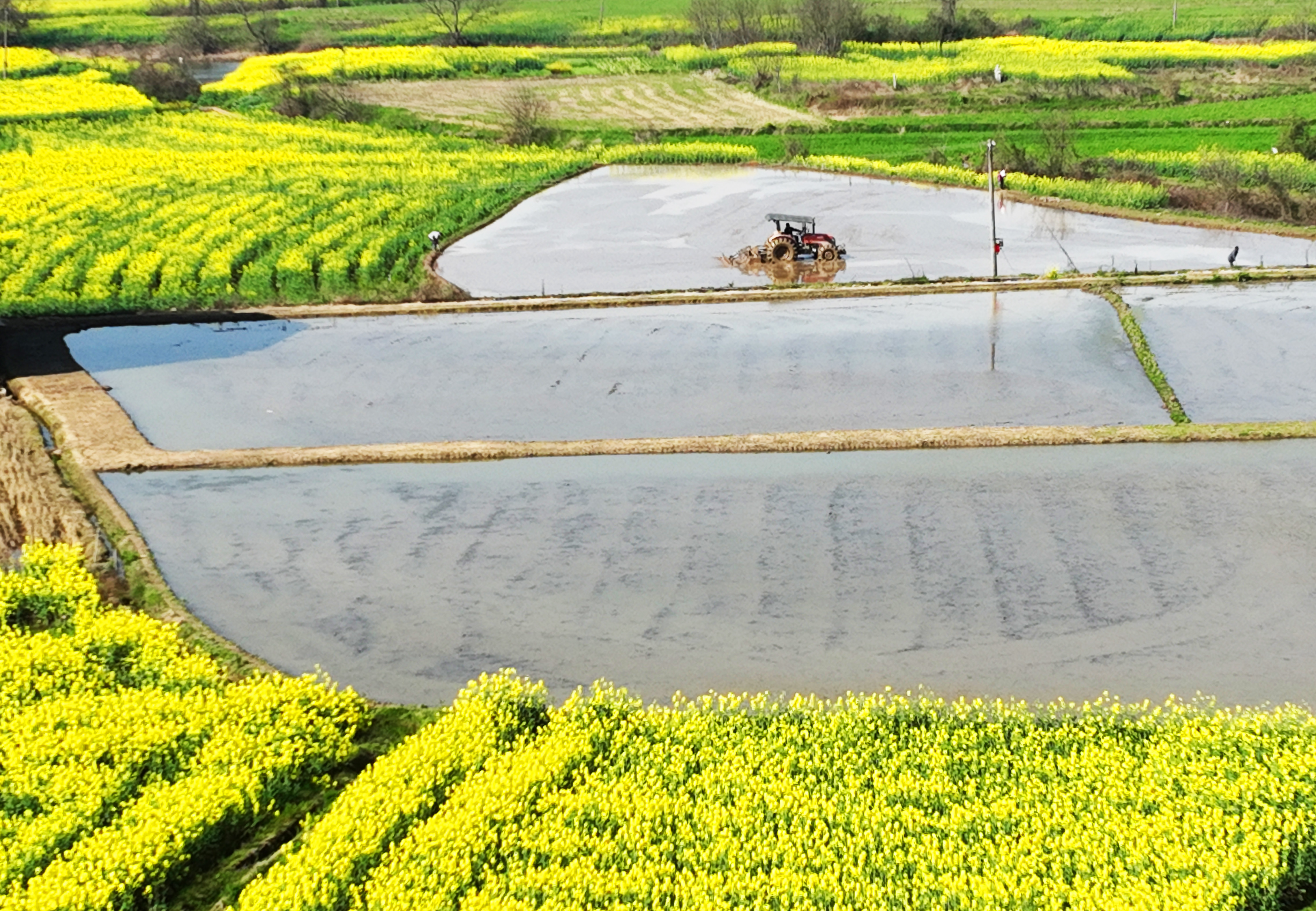 新华社照片,衡阳(湖南),2022年3月8日 耕种在希望的田野上 3月8日,湖南省衡阳市衡阳县渣江镇沐林村,当地村民驾驶农机在翻耕稻田(无人机照片)。 时下气温回暖,正值春耕春管时节,田间地头一派农忙景象。 新华社发(曹正平摄)