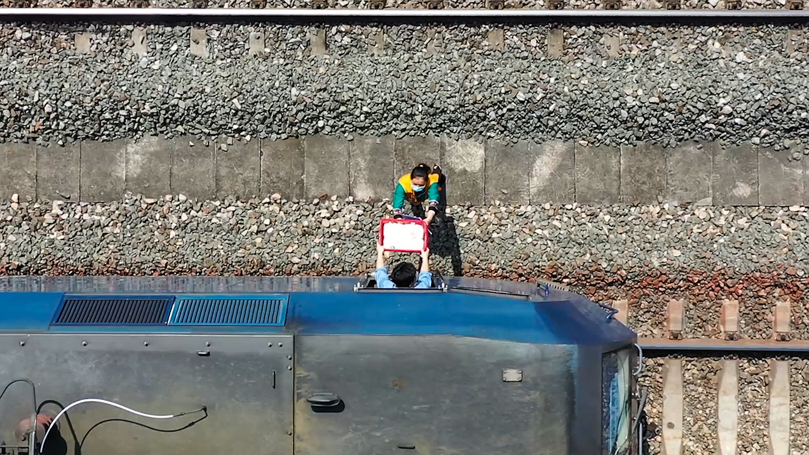 新华社照片,百色(广西),2022年3月8日 布依厨娘给火车司机送餐 六年不间断 3月7日,在百色车务段八渡站,一名布依族厨娘给火车司机送午餐(无人机照片)。 在中国铁路南宁局集团有限公司百色车务段八渡站,4名来自贵州省册亨县八渡镇伟主村的布依族妇女在站内司职厨娘,她们每天要准备100多盒盒饭,且按点及时送达出乘的火车司机处。上岗6年来,她们风雨无阻,从不间断。 新华社记者 张爱林 摄