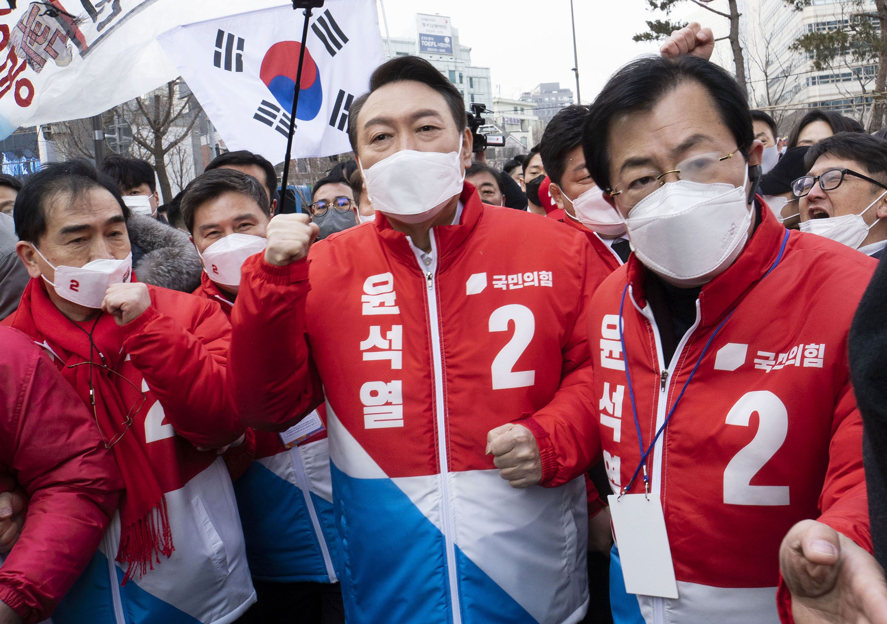2月15日,候选人尹锡悦(中)在韩国首尔参加竞选活动。(新华社发,李相浩摄)