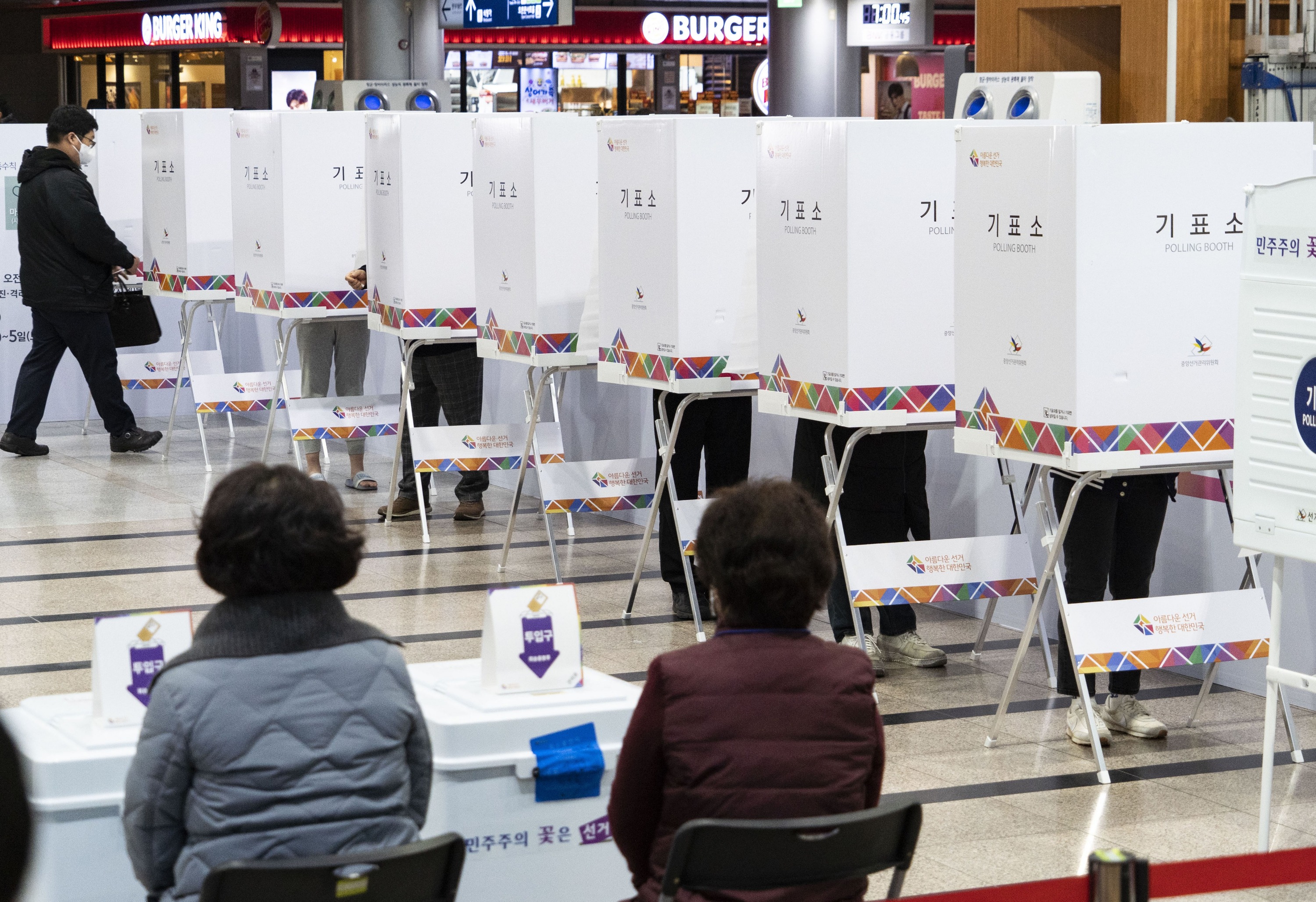 3月4日,选民在韩国首尔一个投票站填写选票。(新华社发,李相浩摄)