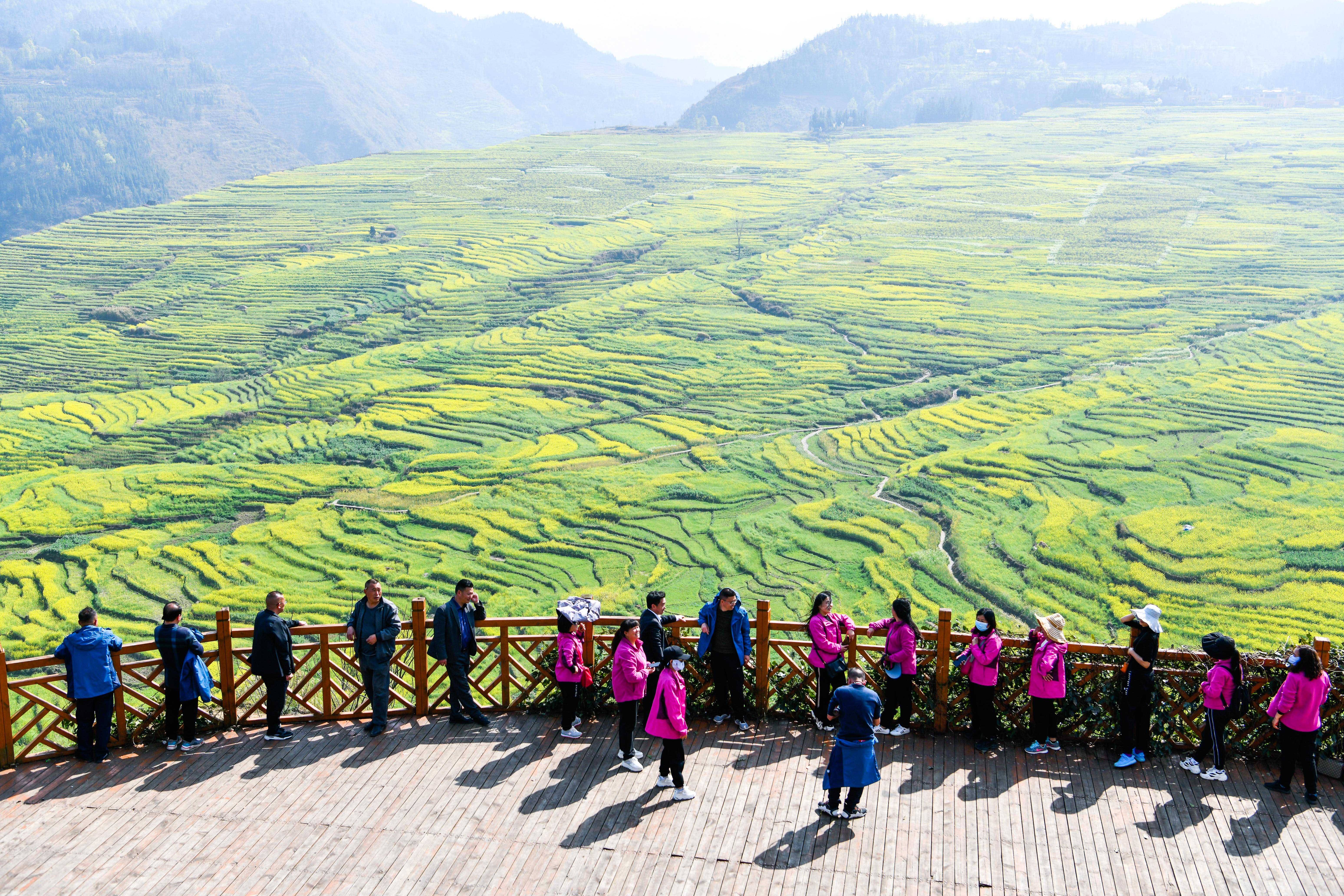 新华社照片,威宁(贵州),2022年3月8日 振兴路上产业兴——贵州产业结构调整春耕一线见闻 3月7日,游客在盘州市新民镇旧屯村的梯田观赏油菜花。 近年来,贵州在巩固脱贫攻坚成果、推进乡村振兴过程中,积极引导农民转变耕作方式,深化产业结构调整,因地制宜发展现代山地特色农业。同时,通过农旅融合、文旅融合的发展模式,助力农业增效、农民增收。 新华社记者 杨文斌 摄