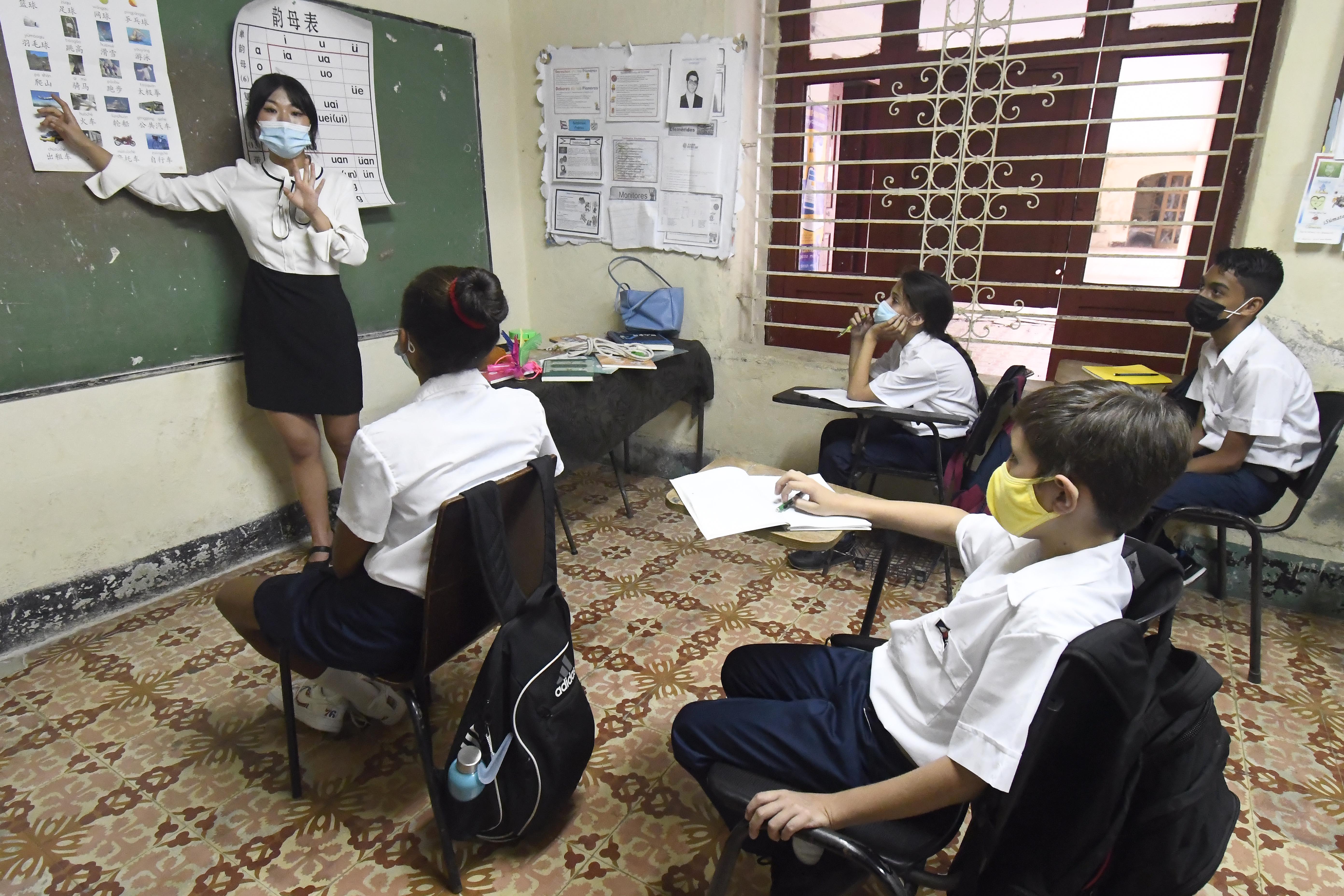 新华社照片,哈瓦那,2022年3月8日 (国际·图文互动)中古合作古巴中学中文教学项目启动 3月7日,中国教师侯嘉琪(左一)在古巴首都哈瓦那的罗德里格斯中学为学生上中文课。 中古合作古巴中学中文教学项目启动仪式7日在位于古巴首都哈瓦那的罗德里格斯中学举行,中文课成为该中学选修课。 新华社发(华金·埃尔南德斯 摄)