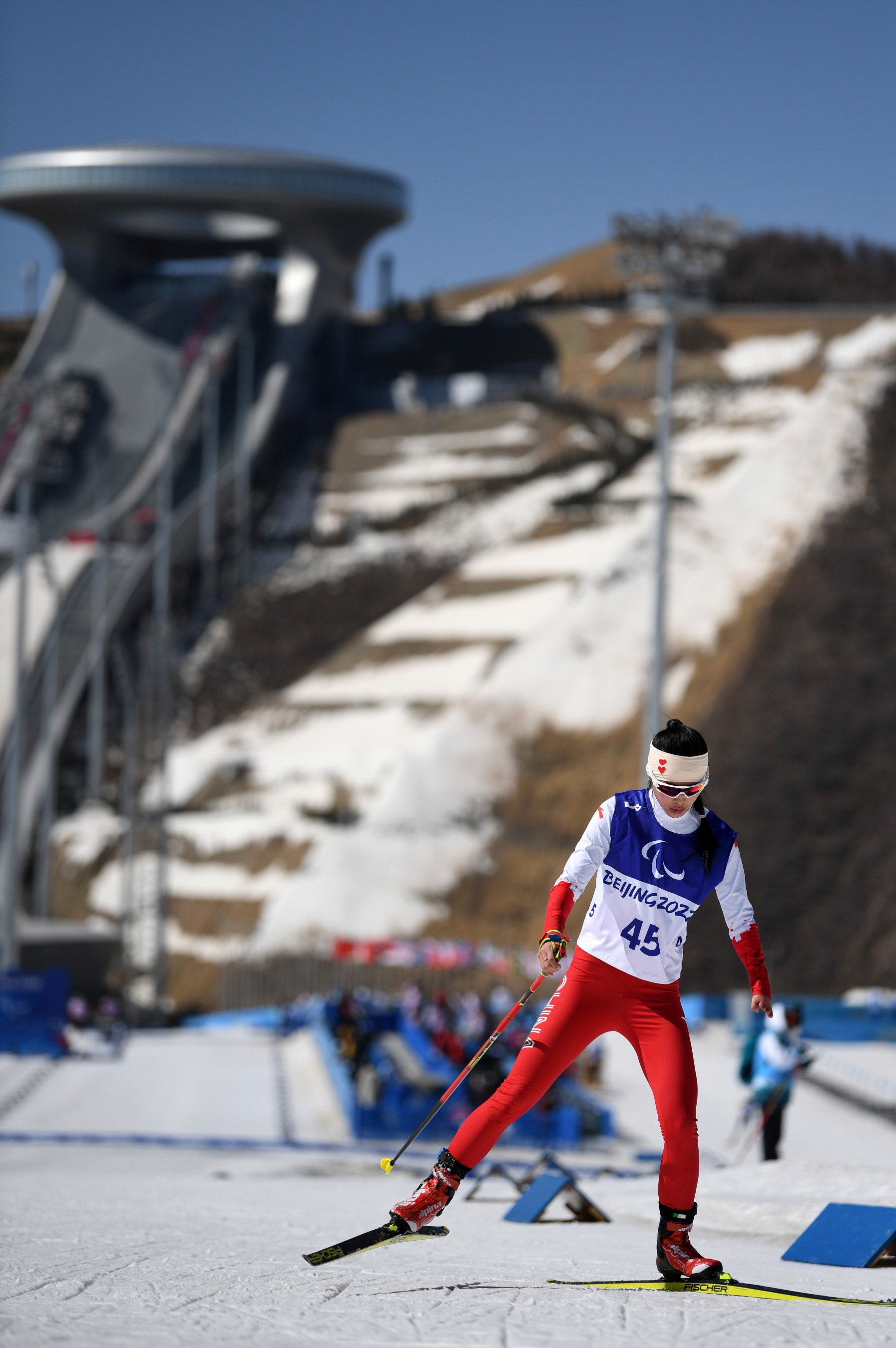 3月8日,中国选手王跃在北京2022年冬残奥会残奥冬季两项女子中距离(视障)比赛中。新华社记者万象摄