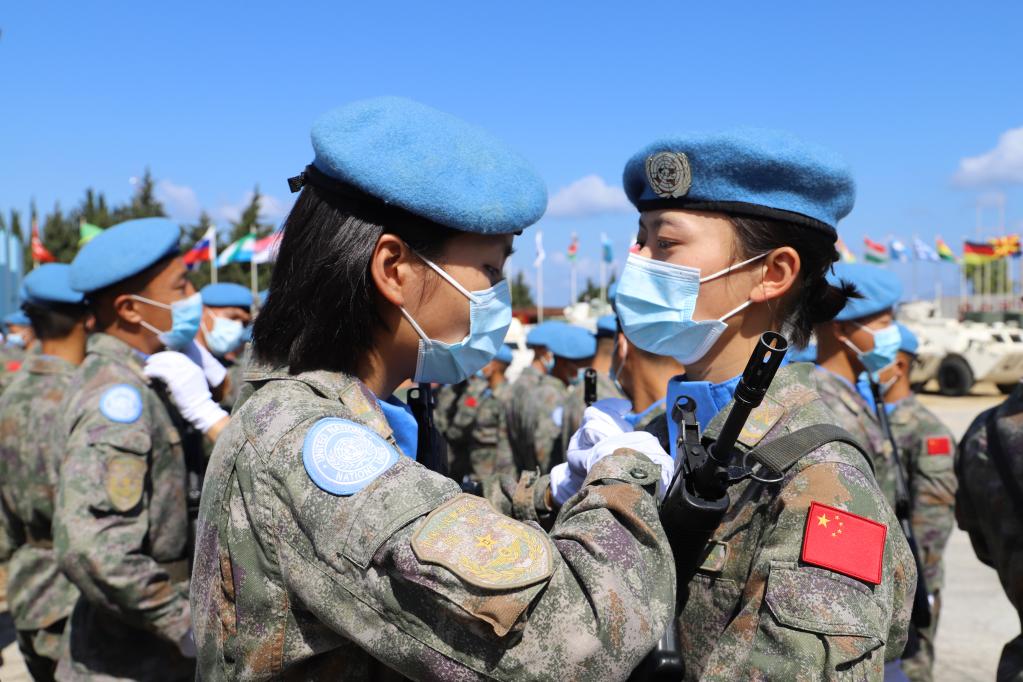 图为2021年6月16日,在黎巴嫩南部辛尼亚村中国维和营举行的授勋仪式上,接受检阅的维和女兵进场前互相整理着装。(新华社发)