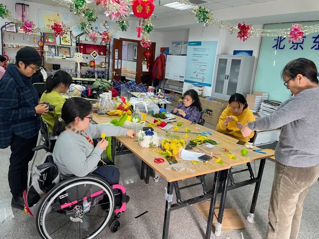 为了确保每一位残障朋友都编织出符合标准的花束,150位参与者,几乎每位都由刘晓云面对面、手把手教授。2021年11月3日至2022年1月14日,两个半月的花束编织过程中,刘晓云的脚步踏遍了150位残障朋友所在的10个区,最远到达了距离城区100多公里的延庆区大庄科乡。