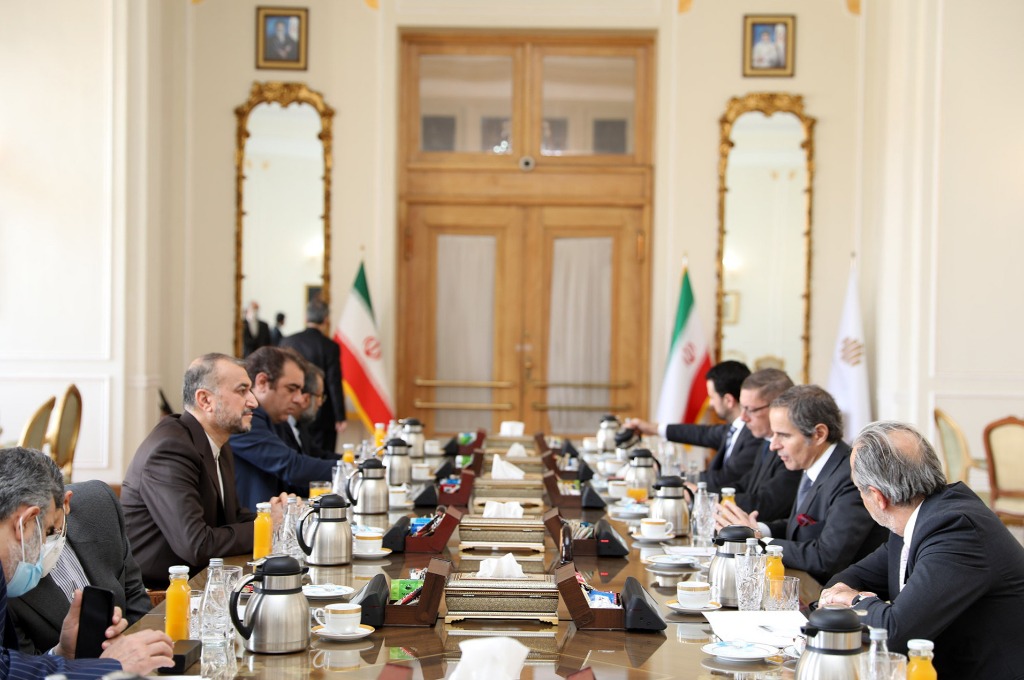 3月5日,伊朗外长阿卜杜拉希扬(左三)在德黑兰会见国际原子能机构总干事格罗西(右二)。(新华社发,伊朗外交部供图)