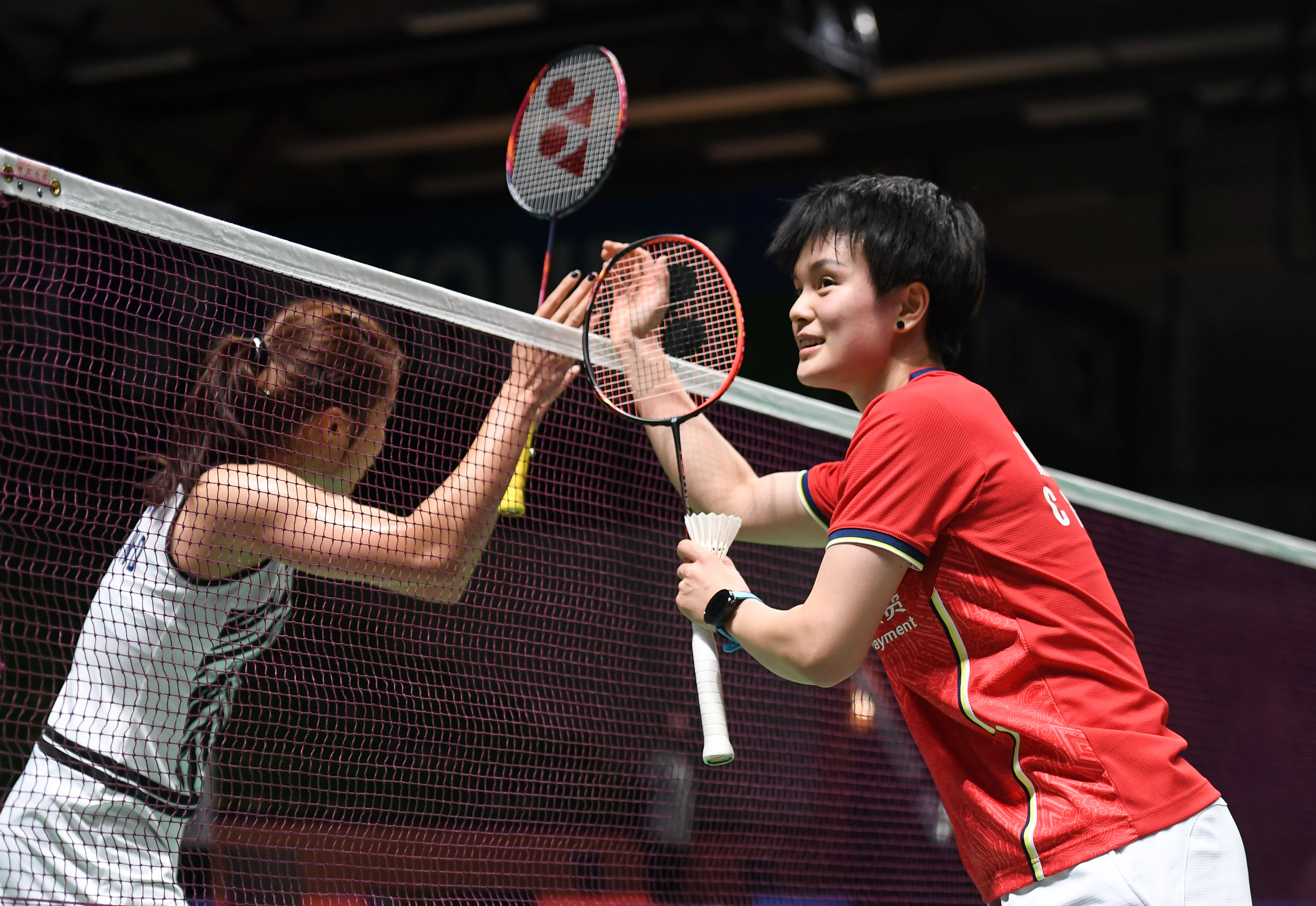 3月8日,王祉怡(右)在德国羽毛球公开赛女子单打首轮比赛后向获胜的因达农致意。新华社记者逯阳摄