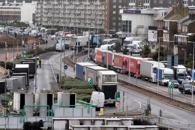 ▲2020年12月22日在英国多佛拍摄的因多佛港关闭而在港口外排队的货车。新华社发 雷伊·唐 摄