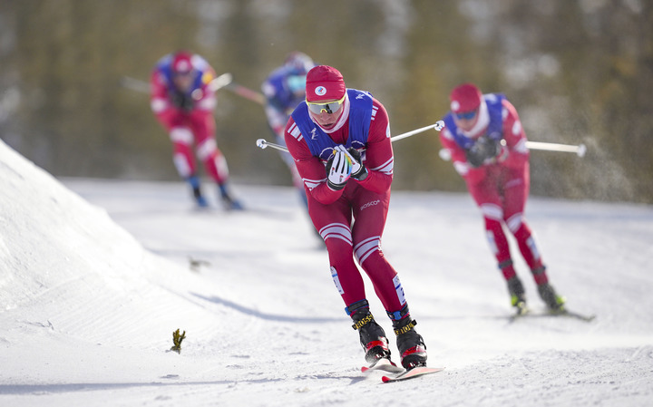 2月19日,冠军俄罗斯奥委会选手亚历山大·博利舒诺夫(前)在北京2022年冬奥会越野滑雪男子50公里集体出发(自由技术)比赛中。新华社记者牟宇摄