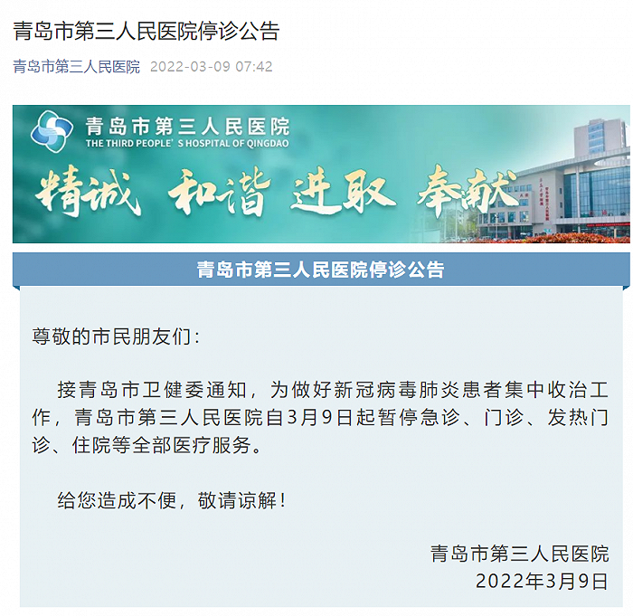 3月9日,青岛市第三人民医院发布停诊公告,接青岛市卫健委通知,为做好新冠病毒肺炎患者集中收治工作,青岛市第三人民医院自3月9日起暂停急诊、门诊、发热门诊、住院等全部医疗服务。