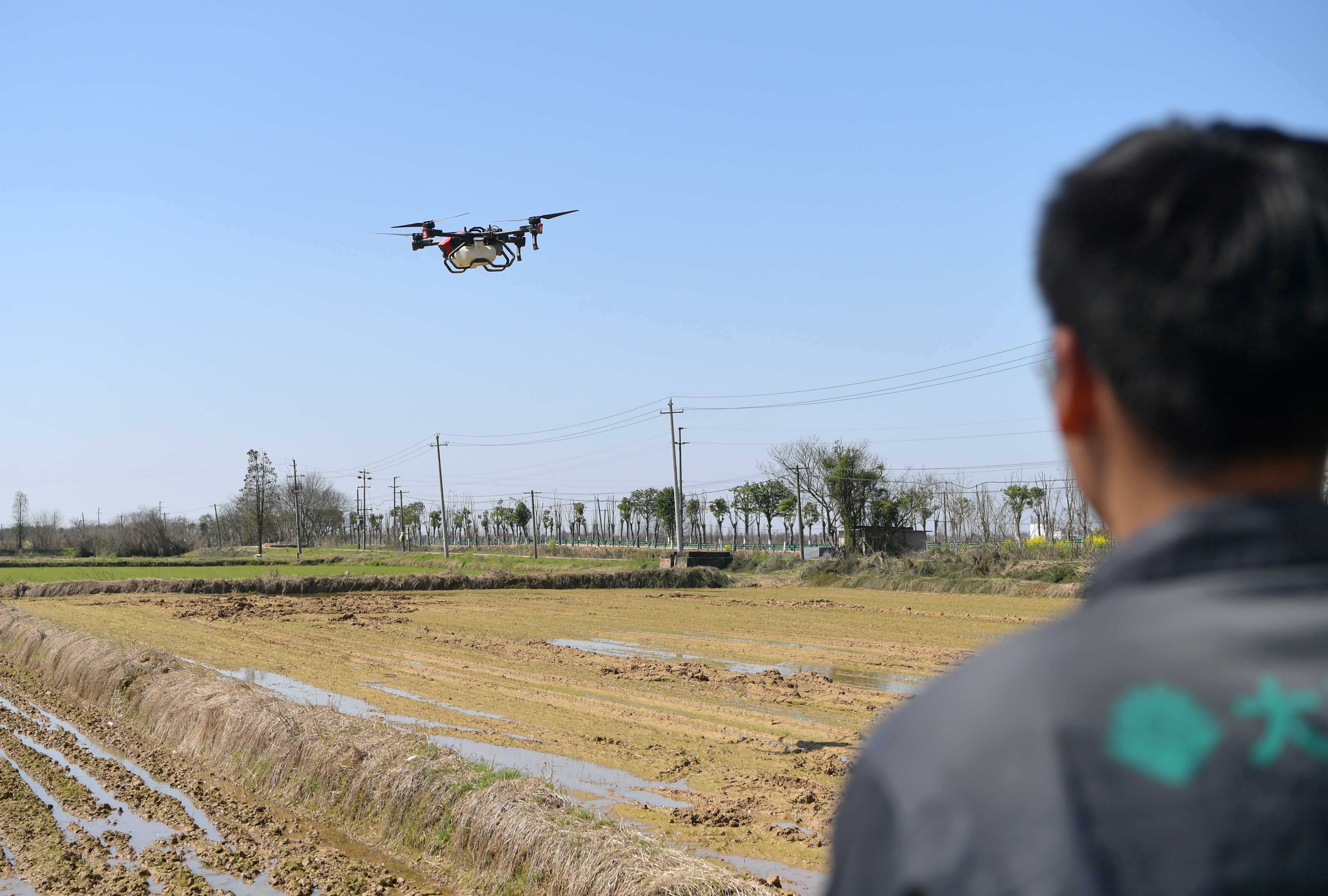 新华社照片,南昌,2022年3月9日 26人种万亩田:鄱阳湖平原上的“智慧春耕” 在江西省南昌县蒋巷镇大田农社,工作人员操控无人机播种(3月8日摄)。 春耕时节,位于鄱阳湖平原的江西省南昌县蒋巷镇大田农社正在开展“智慧春耕”。在这里,无人旋耕机每亩地作业用时7分钟,育秧实现流水线作业,无人机撒播每天可完成播种500亩,无人植保车对油菜田进行植保作业比人工效率提高10倍到20倍……这些设备的使用大大提高了农业生产效率,展示了现代“无人农业”的智慧魅力。 据了解,蒋巷镇大田农社的万亩农场是江西首个“万亩智慧农场”,也是江西现代农业的重点示范项目,农场采用规模化经营、机械化生产、数字化管理,26个人就可以种13000亩田。 新华社记者 彭昭之 摄