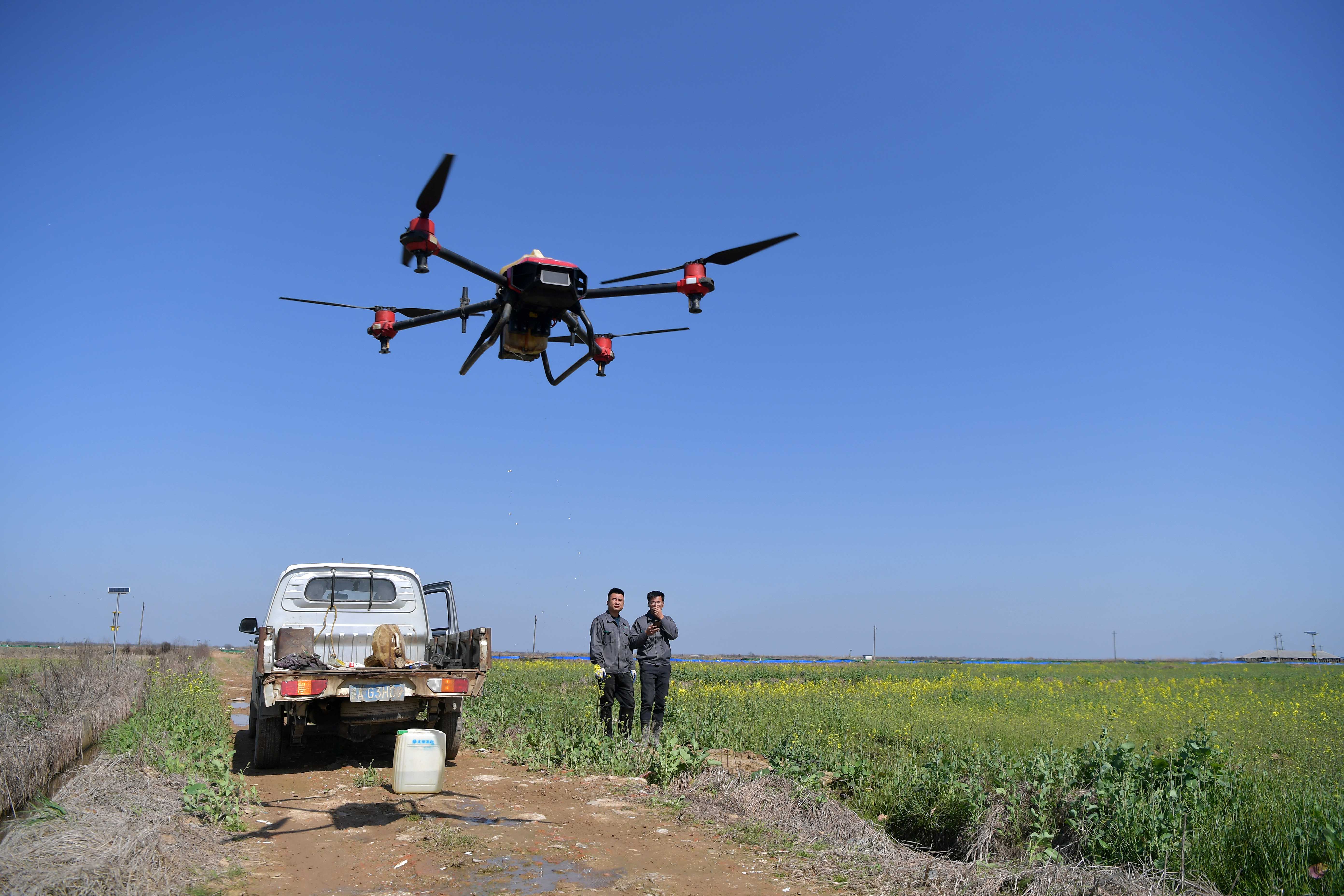 新华社照片,南昌,2022年3月9日 26人种万亩田:鄱阳湖平原上的“智慧春耕” 在江西省南昌县蒋巷镇大田农社,工作人员遥控无人机准备给油菜田打药施肥(3月8日摄)。 春耕时节,位于鄱阳湖平原的江西省南昌县蒋巷镇大田农社正在开展“智慧春耕”。在这里,无人旋耕机每亩地作业用时7分钟,育秧实现流水线作业,无人机撒播每天可完成播种500亩,无人植保车对油菜田进行植保作业比人工效率提高10倍到20倍……这些设备的使用大大提高了农业生产效率,展示了现代“无人农业”的智慧魅力。 据了解,蒋巷镇大田农社的万亩农场是江西首个“万亩智慧农场”,也是江西现代农业的重点示范项目,农场采用规模化经营、机械化生产、数字化管理,26个人就可以种13000亩田。 新华社记者 彭昭之 摄