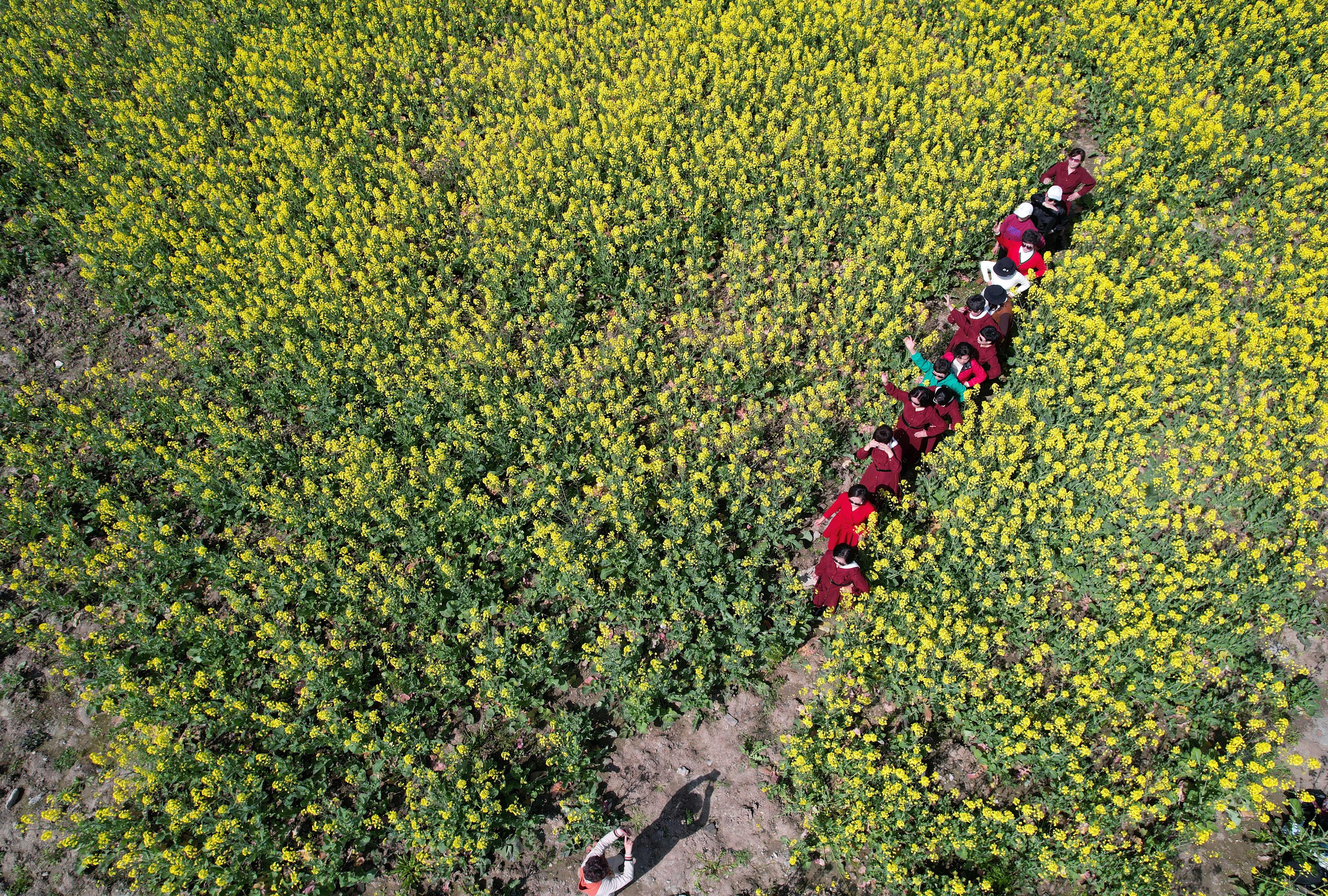 新华社照片,瑞安(浙江),2022年3月9日 不负春光 3月9日,游人在浙江省瑞安市一处路边的油菜花田赏花拍照(无人机照片)。 惊蛰过后,随着气温升高,各地草树绽绿,鲜花吐蕊,田间地头一片繁忙,神州大地呈现出生机盎然的春日景象。 新华社发(庄颖昶 摄)