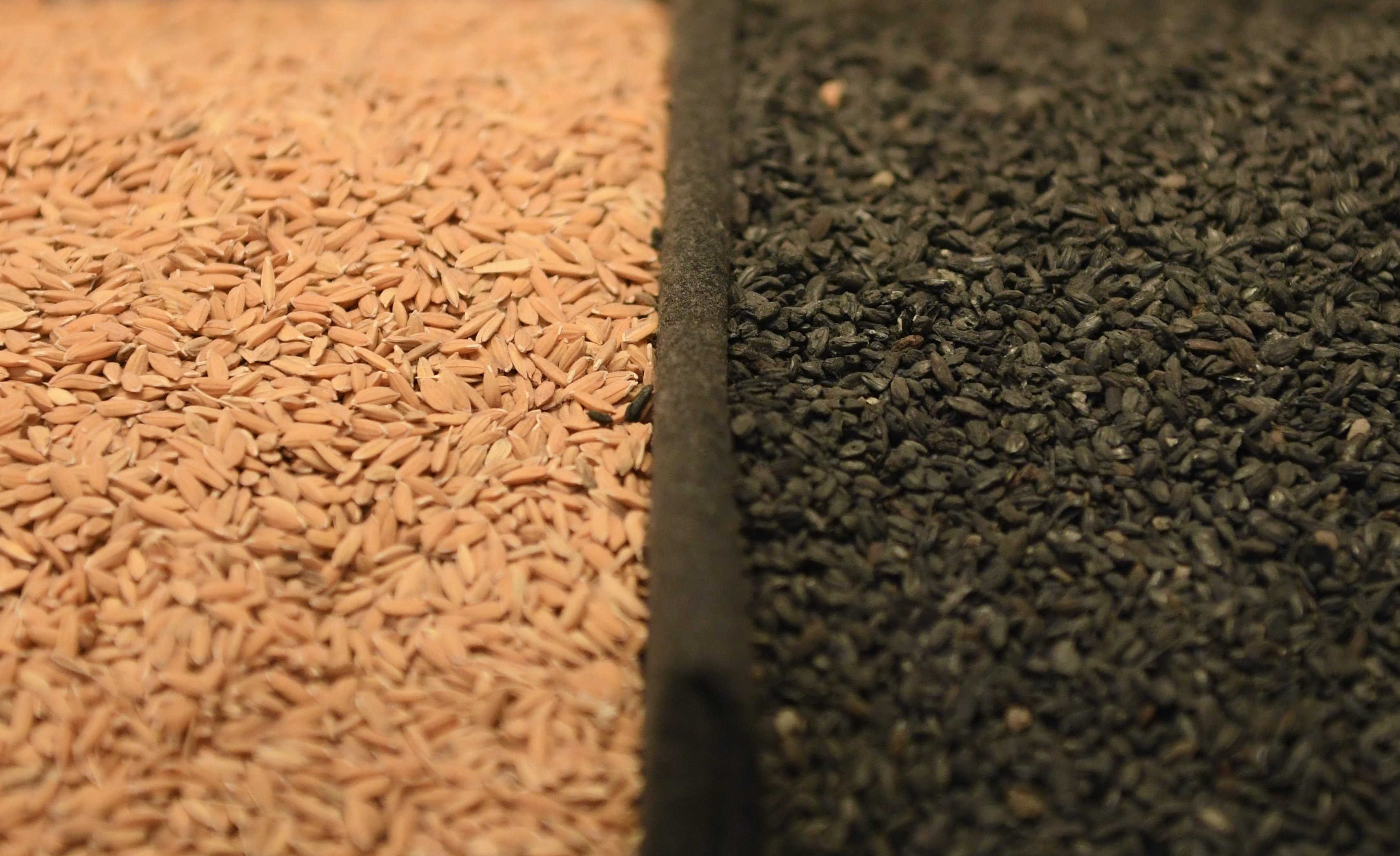 新华社照片,杭州,2022年3月9日 良渚:一粒稻谷穿越五千年 这是良渚博物院展示的现代稻谷和良渚遗址出土的炭化稻谷(右)的实物对比(3月2日摄)。 (配本社同题文字稿) 新华社记者 翁忻旸 摄