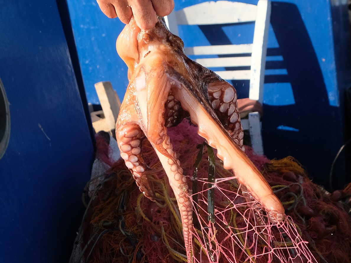 图为2020年7月25日清晨,在希腊斯科派洛斯岛附近的海面上,渔民从网中抓起捕获的章鱼。(新华社发,马里奥斯·罗洛斯摄)