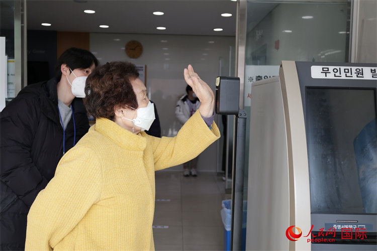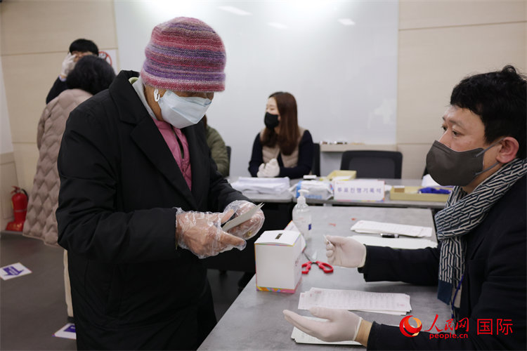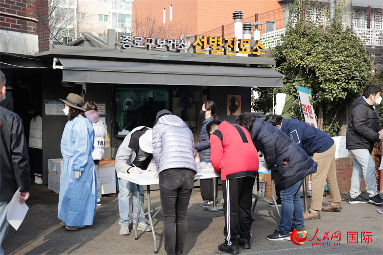 | 2022年3月9日第20届韩国总统选举当天,在首尔市钟路区保健所,前来接受新冠病毒筛查的民众在登记个人信息。伊圣楠摄 |