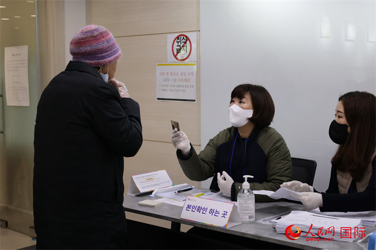 | 2022年3月9日第20届韩国总统选举当天,在首尔市钟路区第三投票所,工作人员确认选民身份。伊圣楠摄 |