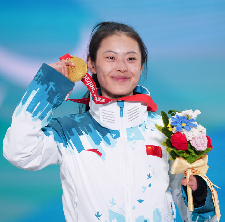 3月6日,在残奥冬季两项女子短距离(站姿)比赛中获得冠军的中国选手郭雨洁在奖牌颁发仪式上。新华社记者彭子洋摄
