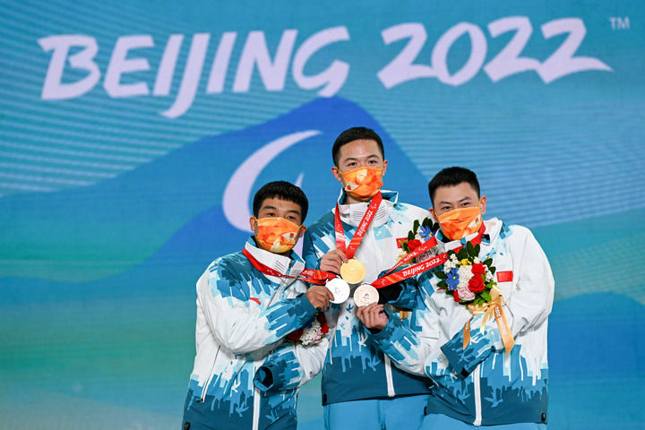 3月7日,中国选手冠军纪立家(中)、亚军王鹏耀(左)和季军朱永钢在北京2022年冬残奥会单板滑雪男子障碍追逐(UL级)颁奖仪式上。新华社记者胡超摄