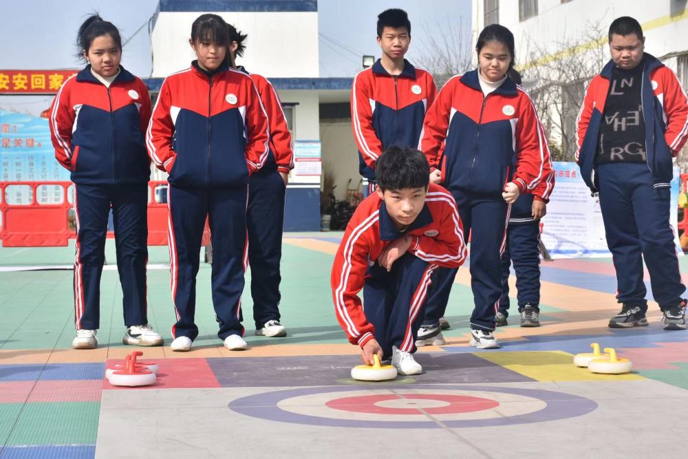 河北邯郸永年区特殊教育学校的学生在体验陆地冰壶项目。新华社记者赵鸿宇摄