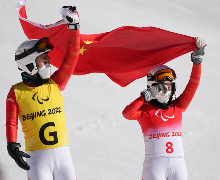 3月7日,中国选手朱大庆(右)和引导员闫寒寒在北京2022年冬残奥会高山滑雪女子全能(视障)比赛后庆祝。新华社记者孙非摄