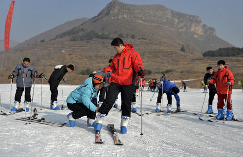 2019年1月11日,河北省南部片区残疾人冰雪运动训练营在邢台市天河山景区滑雪场开营,教练刘芹花(前左)指导肢残者冀普召练习滑雪。新华社发(陈雷摄)
