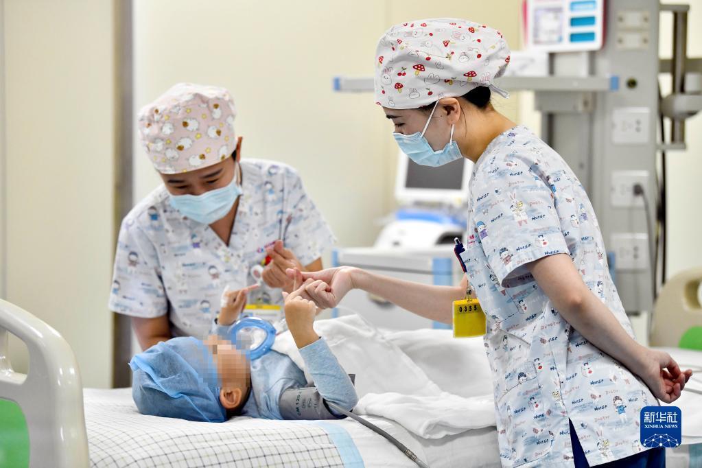 在山东省枣庄市妇幼保健院儿童ICU病房,医护人员为完成靶向治疗药物诺西那生钠的4岁脊髓性肌萎缩症患儿加油鼓劲(1月1日摄)。