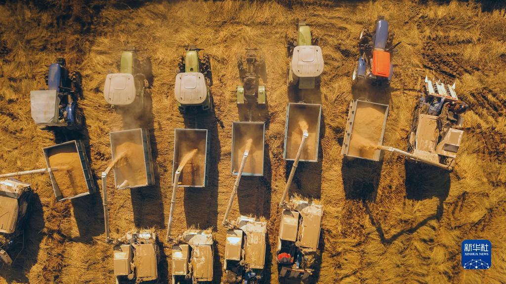 在辽宁省铁岭市铁岭县新台子镇西三家子村,万鑫水稻种植专业合作社把机械化收割下来的水稻装车(2021年10月20日摄,无人机照片)。