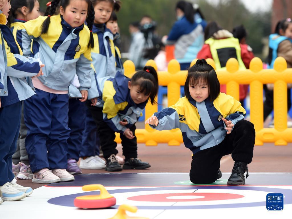 安徽省合肥市泰山路幼儿园的小朋友在开学典礼上体验“旱地冰壶”游戏(2月16日摄)。