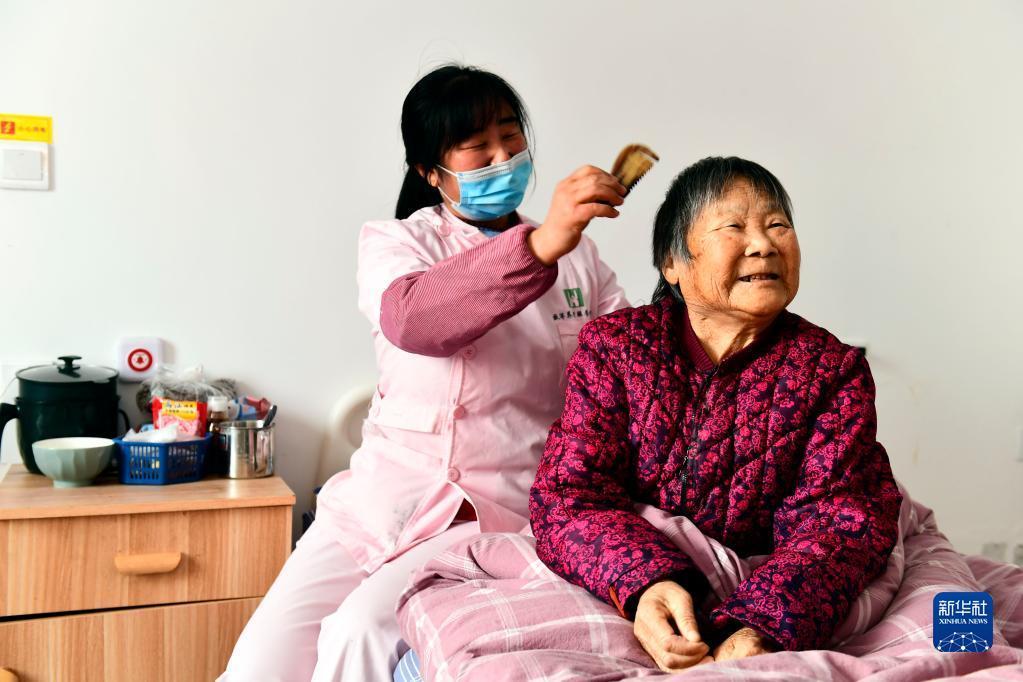在山东省日照市岚山区黄墩镇“如康家园”残疾人之家,工作人员为老人梳头(3月1日摄)。