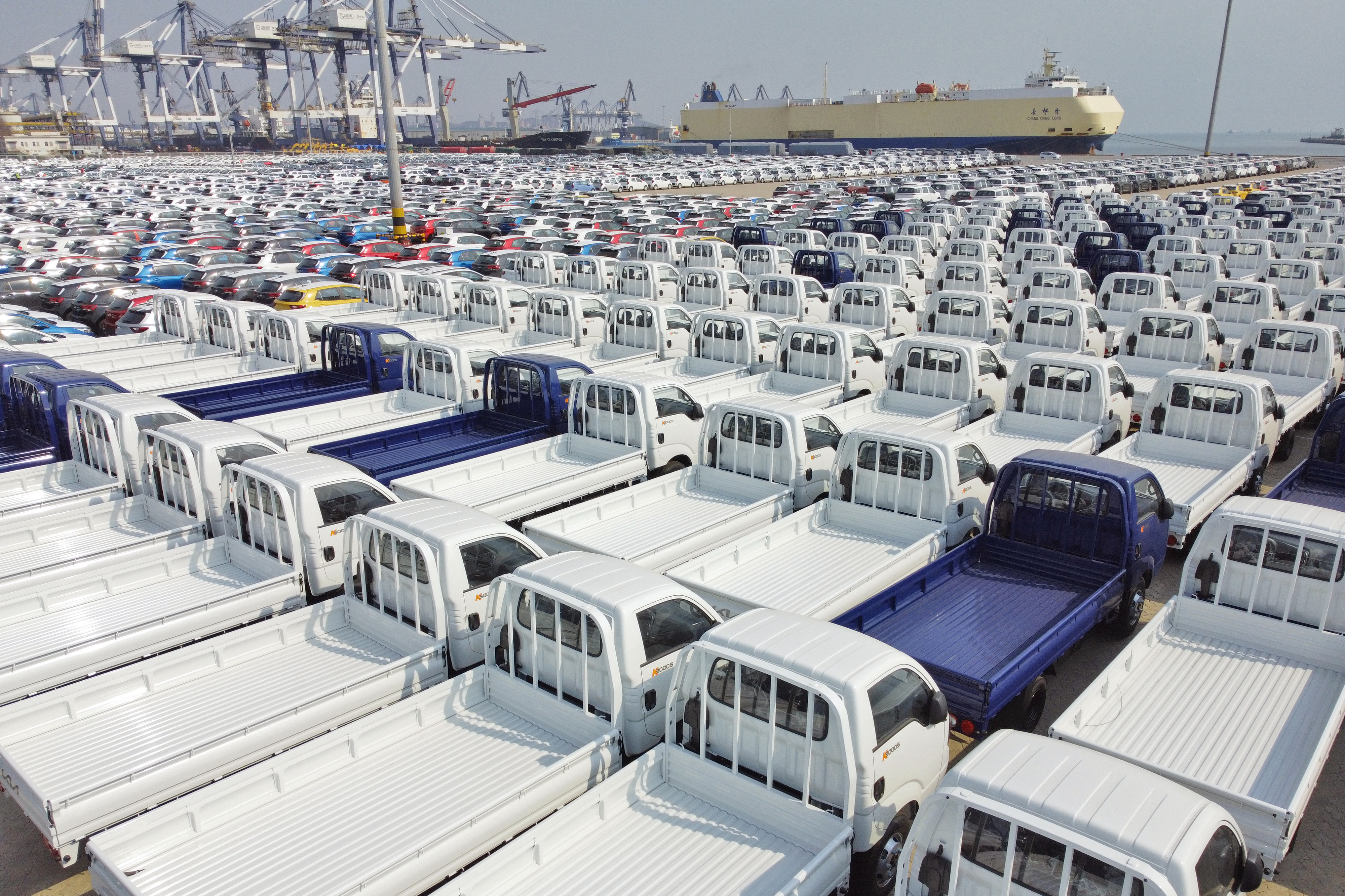3月7日,大批出口商品车在山东港口烟台港集结等待装船(无人机照片)。新华社发(唐克 摄)