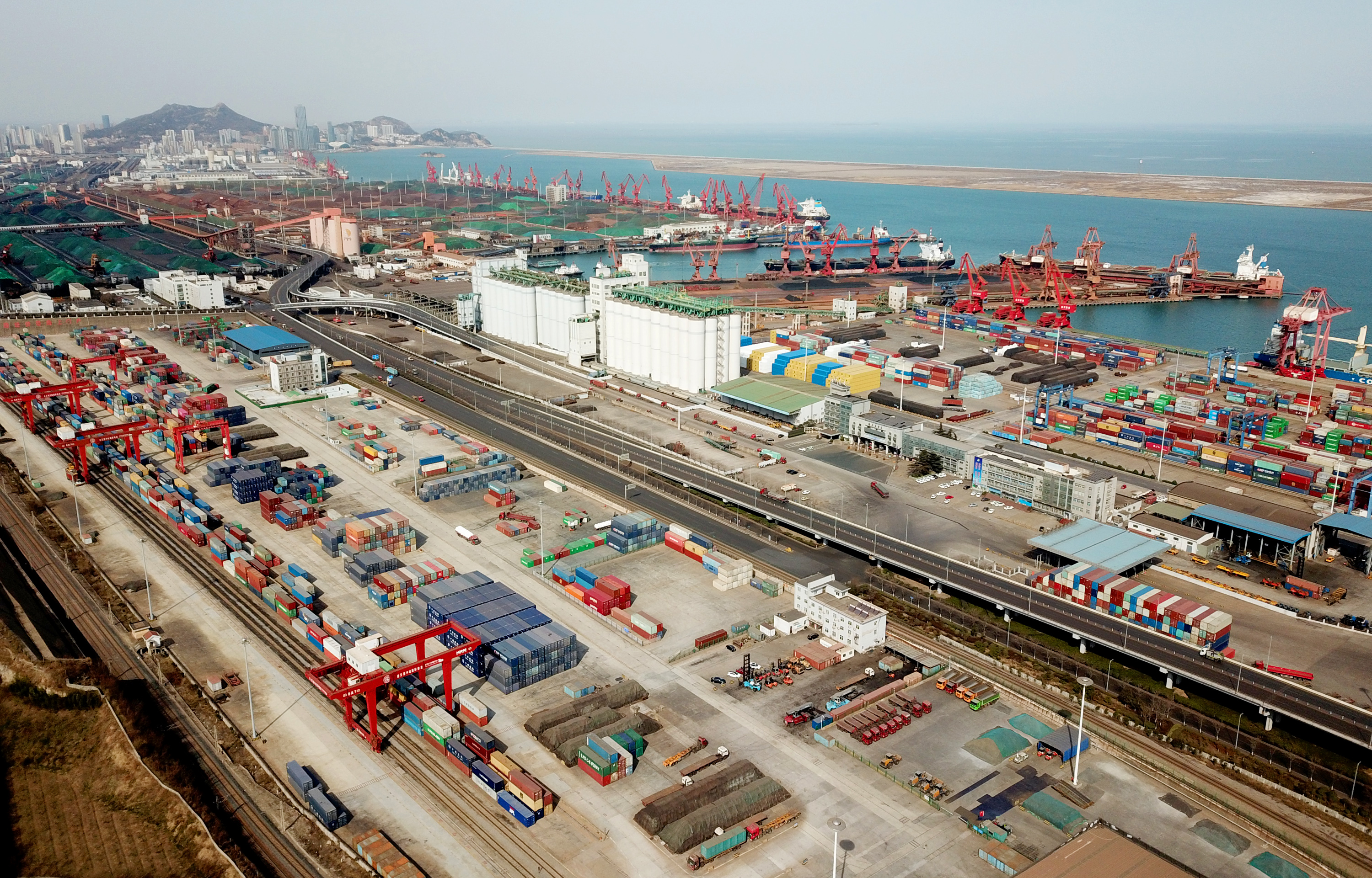 3月7日拍摄的江苏连云港港口码头等待作业的大批集装箱(无人机照片)。新华社发(耿玉和 摄)