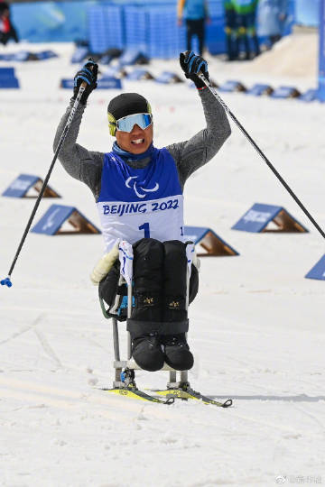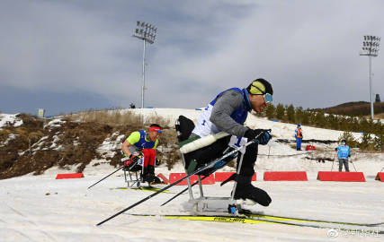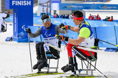 【#郑鹏毛忠武包揽金银牌#】3月9日,北京2022年冬残奥会残奥越野滑雪男子短距离(坐姿)决赛在河北张家口国家冬季两项中心举行。中国选手郑鹏、毛忠武夺得金、银牌。(新华社冬残奥报道团队)